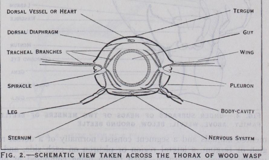 A true insect has its body divided into three distinct regions-- head, thorax and abdomen—each composed of a definite number of segments (fig. I). The head bears a single pair of feelers or antennae, a pair of mandibles and two pairs of accessory jaws or ,naxillae. The thorax carries three pairs of legs (hence the term Hexapoda) and usually two pairs, more rarely one pair, of wings. The abdomen is devoid of walking limbs and the genital opening is situated near the anal extremity of the body. Respiration takes place by means of internal air-tubes or tracheae which communi cate with the exterior by a variable number of paired openings or spiracles. After hatching from the egg the further development is rarely direct and a metamorphosis is usually undergone.