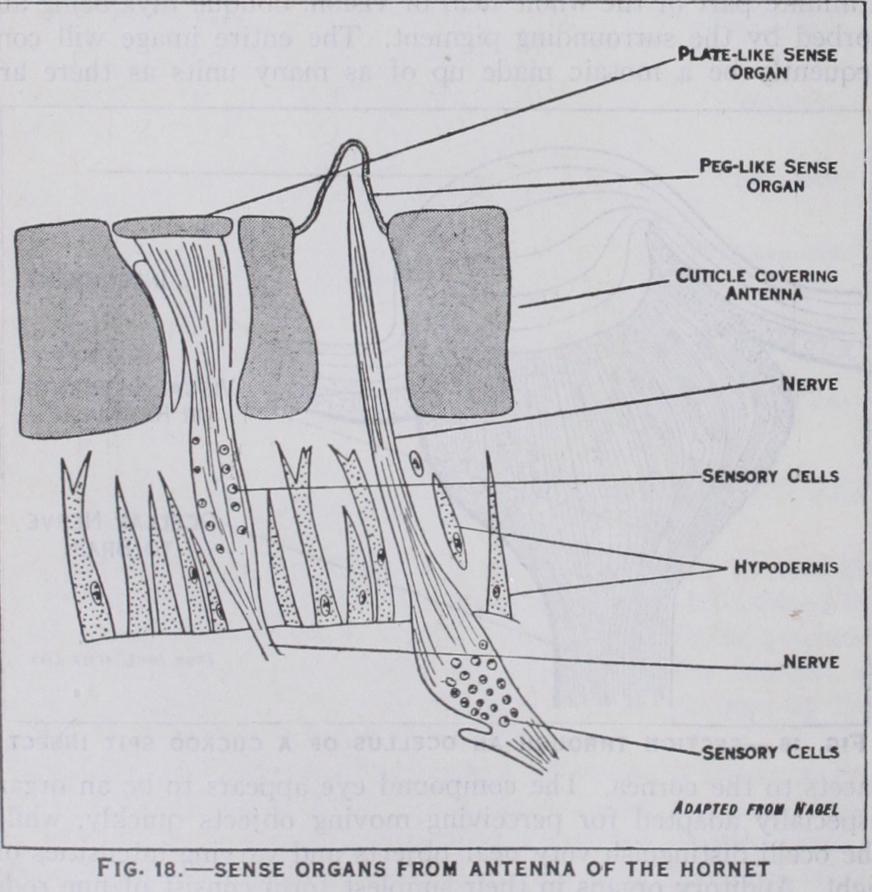 Connected with the nervous system are the organs of special sense. Visual organs consist of compound eyes and ocelli: typ vided cornea is replaced by a single biconvex lens which over lies the visual elements (fig. i6). Vision by means of compound eyes is explained by the mosaic theory which maintains that only those rays of light entering a facet which are parallel with the long axes of the ommatidia, reach the retina where they register a minute part of the whole field of vision, oblique rays being ab sorbed by the surrounding pigment. The entire image will con sequently be a mosaic made up of as many units as there are facets to the cornea. The compound eye appears to be an organ especially adapted for perceiving moving objects quickly, while the ocelli distinguish very near objects and varying intensities of light. Auditory organs in their simplest form consist of fine rods suspended between two points of the integument and connected with nerve-fibres : in such a condition they are present in many insects and larvae. In other cases more elaborate organs are de veloped, and in grasshoppers (Acridiidae) there is a tympanic membrane on either side of the first abdominal segment which is in contact with a delicate sac containing fluid and receiving nerve-endings (fig. 17). In long-horned grasshoppers and crickets a small swelling below the knee joint bears two narrow slits which lead into chambers whose delicate walls are in contact with air tubes and bear nerve-endings. In both these examples sound waves impinge on an auditory membrane whose vibrations are transmitted by nerve fibres to the central nervous system. Sense perception of other kinds takes place by means of modified hairs covered by a very delicate cuticle and in direct connection with a