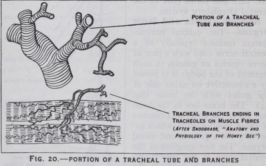 Nervous System and Sense Organs.—The central nervous system consists typically of a ventral nerve cord with a pair of nerve centres or ganglia in each segment of the body : it is joined by a connective on either side of the gullet with the brain (fig. 14). The brain lies in the head just above the gullet and consists of three fused ganglia which in nervate the antennae and visual organs. The first ganglion of the ventral cord is the suboesoph ageal ganglion which lies. in the head just below the gullet and innervates the mouth-parts. The next three ganglia are situated one in each of the thoracic segments and innervate the wings and legs, while the remaining ganglia of the ventral cord belong to the abdomen. In the more specialized insects a variable number of the ganglia undergo fusion and as in the housefly, all the thoracic and abdominal ganglia are merged into a common centre.