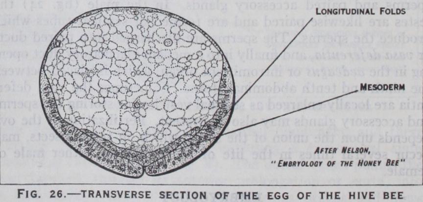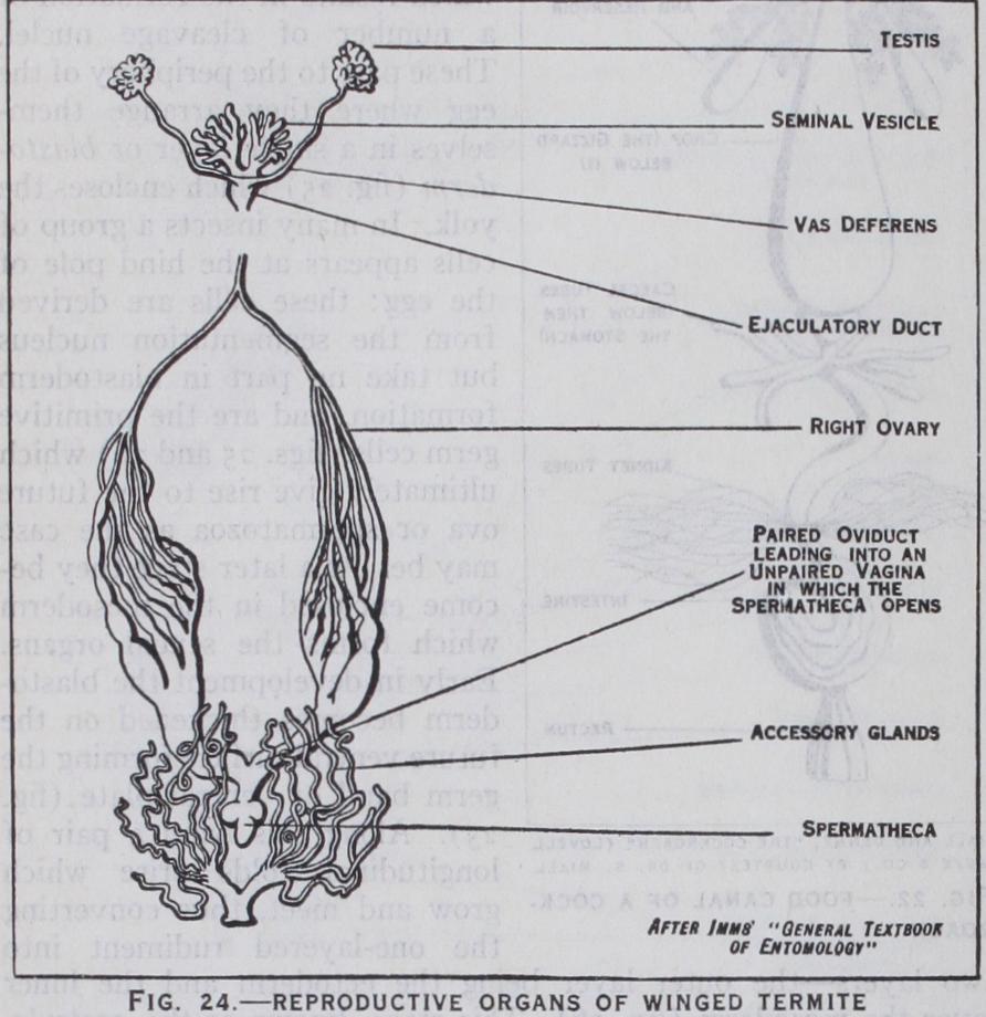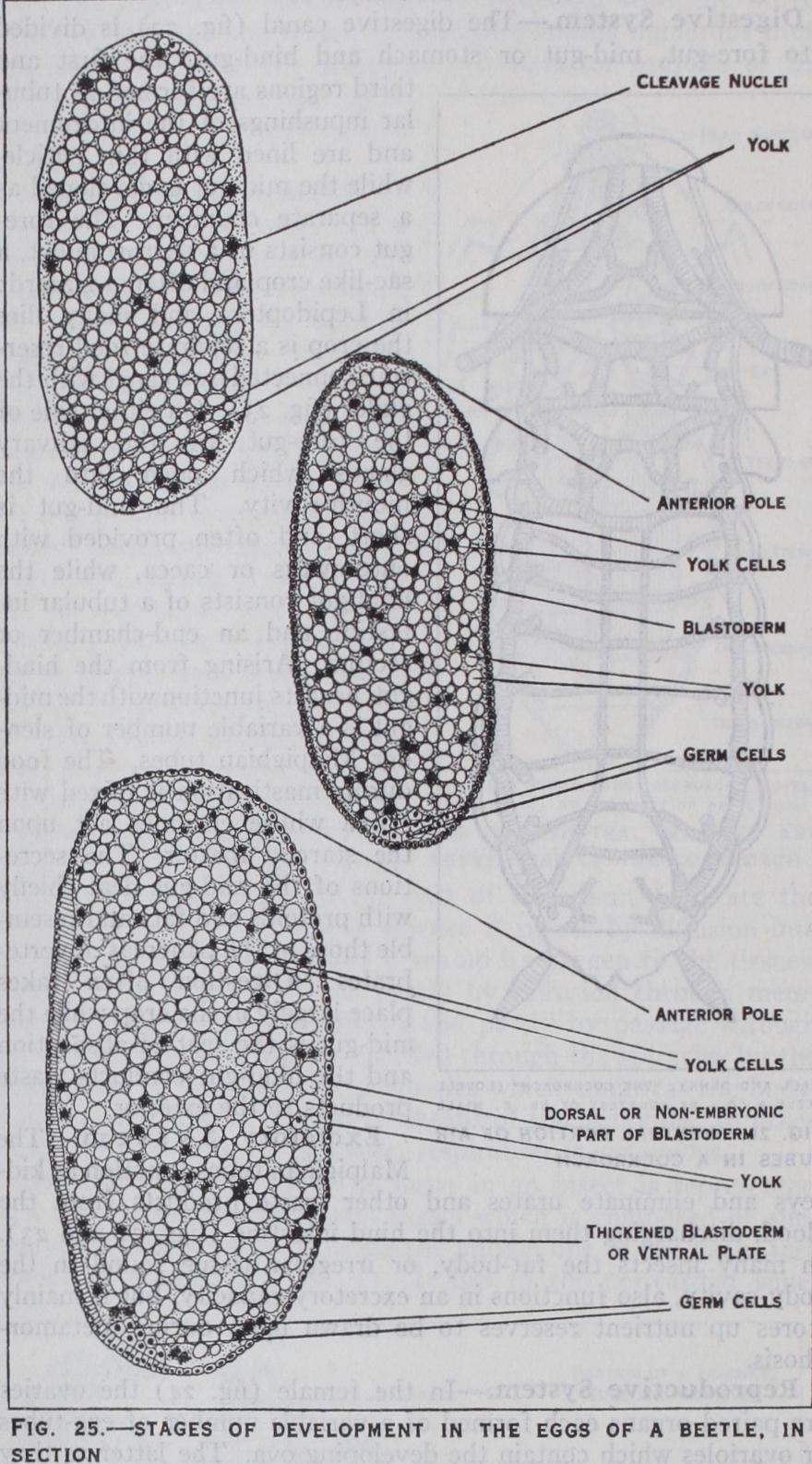 maturition and fertilization of the egg have taken place, devel opment commences by the divi sion of the segmentation nucleus which results in the formation of a number of cleavage nuclei. These pass to the periphery of the egg where they arrange them selves_ in a single layer or blasto derm (fig. 25) which encloses the yolk. In many insects a group of cells appears at the hind pole of the egg : these cells are derived from the segmentation nucleus but take no part in blastoderm formation, and are the primitive germ cells (figs. 25 and 26) which ultimately give rise to the future ova or spermatozoa as the case may be. At a later stage they be come enclosed in the mesoderm which forms the sexual organs. Early in development the blasto derm becomes thickened on the future ventral surface forming the germ band or ventral plate (fig. 25). Along this band a pair of longitudinal folds arise which grow and meet, thus converting the one-layered rudiment into two layers—the outer layer being the ectoderm and the inner layer the mesoderm (fig. 26). This stage, known as the gastrula, which is an important phase in the development of all animals, is subject to several variations in insects.
