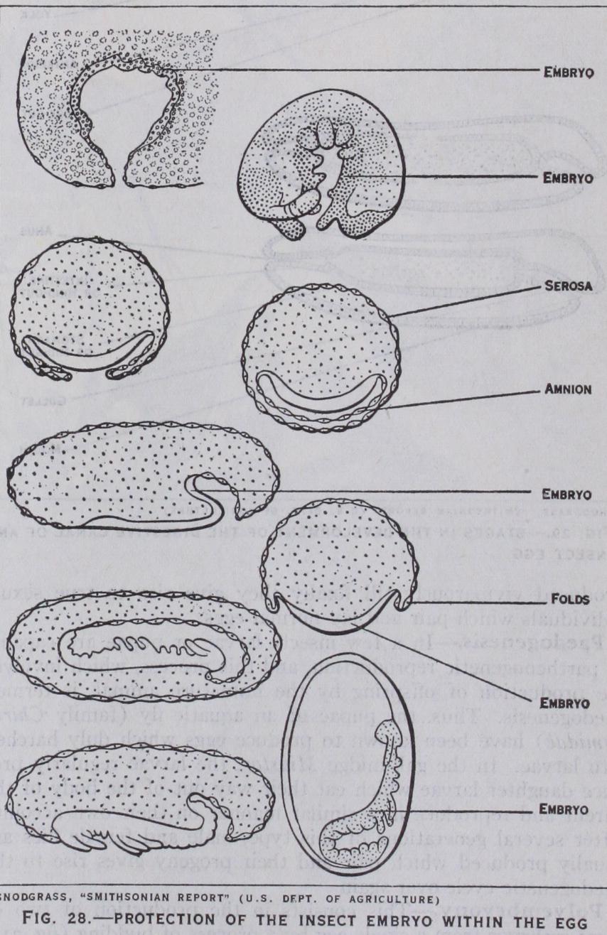 (fig. 28).—In some insects such as beetles the embryo remains at the surface of the yolk, but it sub sequently becomes covered by f olds which arise along its edges. These folds grow towards one another and fuse, and in this way enclose the embryo in an amniotic cavity which is covered by an outer membrane or serosa and an inner membrane or amnion (fig. 28). In some other insects such as butterflies and dragon flies the embryo becomes sunk into the yolk and a portion of the non-embryonic part of the blastoderm becomes necessarily carried in with it, forming the amnion. In a moth or butterfly the embryo sinks into the yolk without change of orientation, but in dragon flies it moves through an arc until its position is completely re versed on the dorsal side of the yolk. Here it rests for a while and again passes through the same arc to its original ventral position.