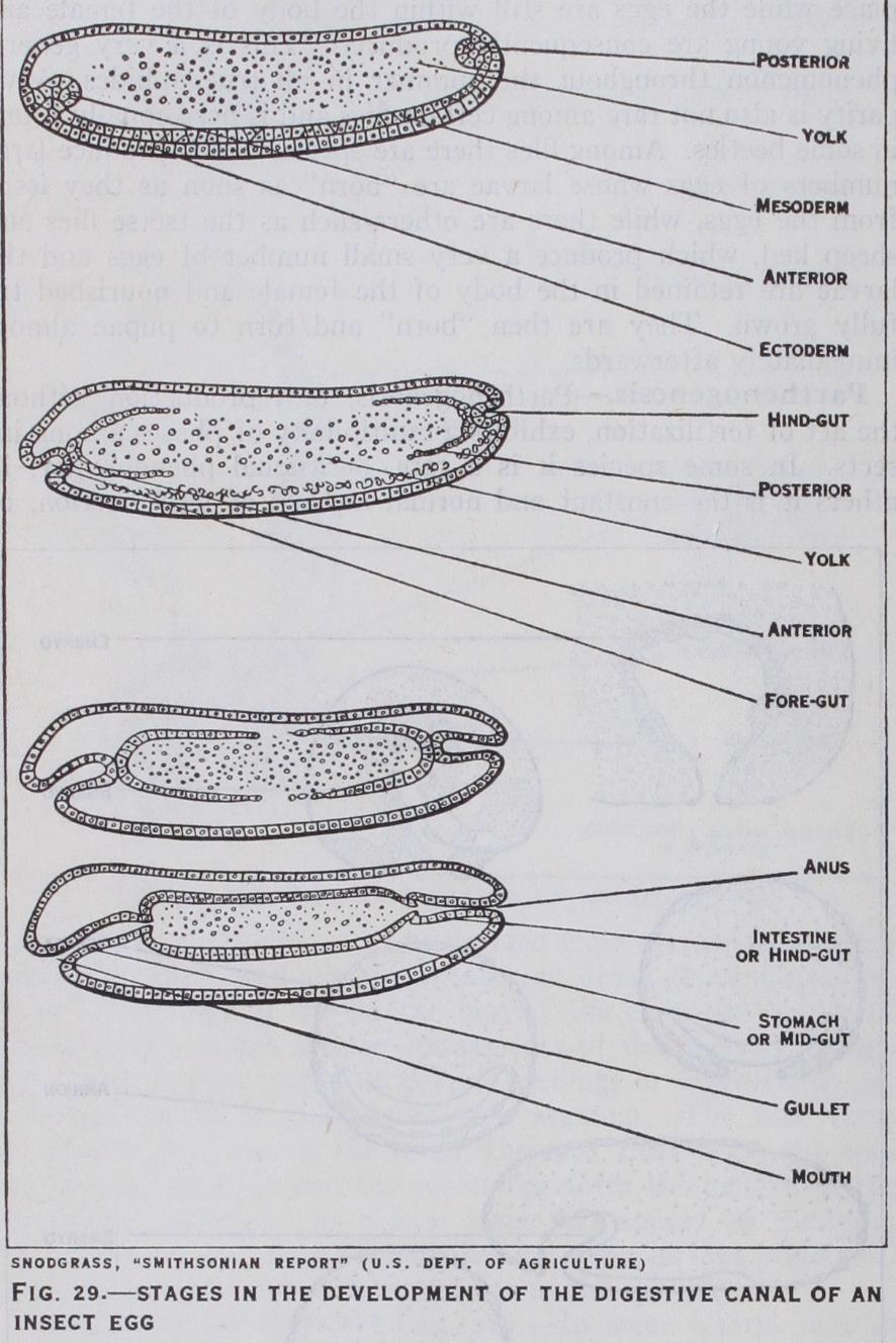 (fig. 29).—In the positions of the future mouth and anus the ectoderm becomes inpushed to form the rudiments of the fore-gut and hind-gut respectively. The method of origin of the mid-gut is much disputed: by some embryologists it is believed to arise partly from the mesoderm and partly from cells budded off from the previously mentioned gut-rudiments others claim its origin from the latter source only. The Malpighian tubes develop as outgrowths from the hind-gut when the latter is little more than a pit, and subsequently become carried inwards as the gut-rudiment deepens.