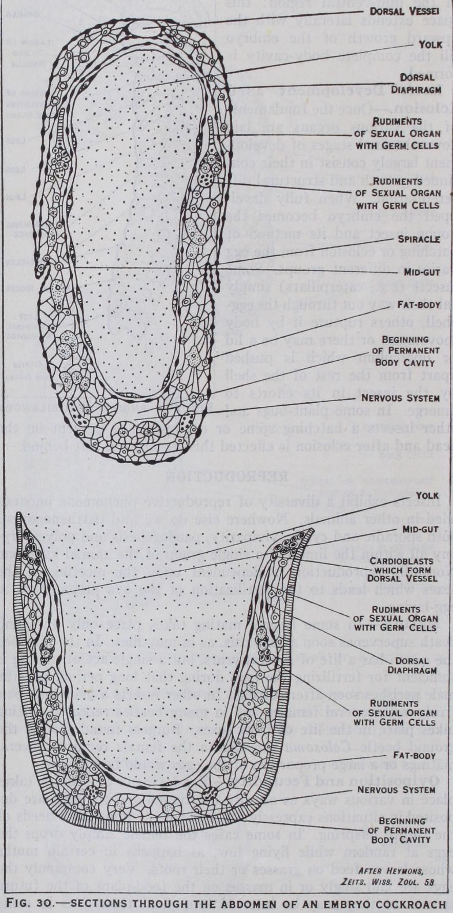 (fig. 3o).—The mesoderm or inner layer of the germ band undergoes segmenta tion corresponding with that of the ectoderm. Coelomic cavities appear in these mesoderm segments, but they subsequently break down and take little part in the formation of the permanent body cavity as happens in so many animals. The mesoderm gives rise to the dorsal vessel, fat-body, muscles and the sexual organs and their paired ducts, but the vagina and the ejaculatory duct respec tively are derived as inpushings of the ectoderm. The body-cavity is chiefly formed from a space that is produced by the separation of the yolk from the mesoderm in the mid-ventral region : this space extends laterally with the upward growth of the embryo till the complete body-cavity is formed.