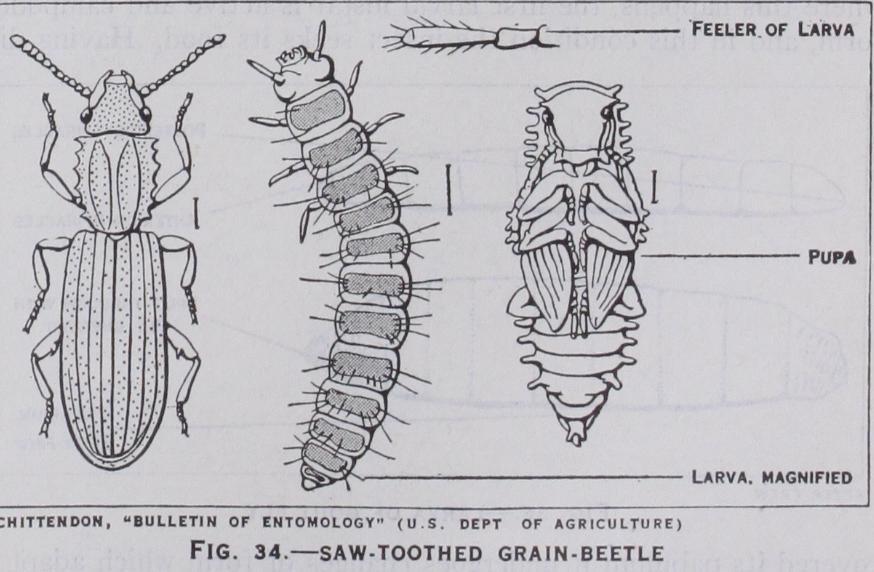 The term pupa is applied to the resting, passive stage in the life I of insects with a complete meta morphosis, and during this instar it is incapable of feeding. The pupa is an acquired transitional phase during which the developing wings, legs and other append ages of the future insect appear outside the body. Three types of pupae are generally recognized. In the free pupa (figs. 34 and 37) the wings and legs are free from any secondary attachment to the body, and such pupae have considerable capacity for move ment. In mosquitoes and midges the pupae are aquatic, and are active swimmers : in certain other insects they are able to work their way above ground to facilitate the emergence of the perfect insects. The obtected pupa (fig. 33) has the wings and legs glued down to the body and there is but little freedom of movement : this type is characteristic of most moths. The coarctate pupa (fig. 36) is found in all the higher groups of flies. In these insects the last larval skin is not cast off but remains outside the pupa as a hardened shell forming a capsule or puparium.