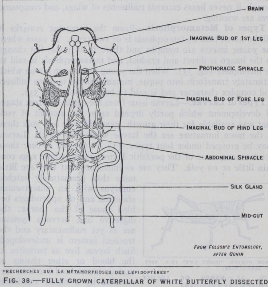 Hypermetamorphosis.—When an insect passes through two or more markedly different larval instars it is said to undergo hypermetamorphosis. This phenomenon is accompanied by a marked change in the life of the larva concerned. In most cases where this happens, the first larval instar is active and campodei f orm, and in this condition the insect seeks its food. Having dis ;overed its pabulum it undergoes changes of form which adapt it o its subsequent mode of life. Hypermetamorphosis is evident n some beetles (see COLEOPTERA), in certain flies, in most of the ;roups of parasitic Hymenoptera (q.v.) and in some other insects. Pupa.—Near the end of the larval period the insect prepares tself for transformation into the pupa, usually constructing a :ocoon or other type of protection. A preliminary period of luiescence then follows when the insect is in a condition termed he pre-pupa (fig. 37). In this stage the wings and appendages irst become evident outside the body, and its general form fore shadows that of the imago. The pre-pupa is loosely enclosed in the old larval skin, and after the latter is moulted the true pupal condition is assumed. Since the pre-pupal and pupal instars are particularly vulnerable, either protection or concealment is neces sary. It is only rarely that pupae are quite exposed as happens in those of many butterflies, but, in this case, protection is afforded by their colouration, which often closely assimilates with the natural surroundings. The larvae of many moths and beetles bur row in the ground when about to pupate, and then transform within earthen cells composed of soil particles, held together by an adhesive secretion. Numerous other insects construct cocoons of various extraneous materials woven together with a warp of silk, while in many moths the cocoons are formed entirely of silk : some of the most elaborate cocoons are those constructed by the great silkworm moths of the family Saturniidae. Among true flies there is seldom a cocoon and in those with a coarctate pupa, the latter is protected by being concealed below the soil, in refuse or other situations where the lar val life was passed.