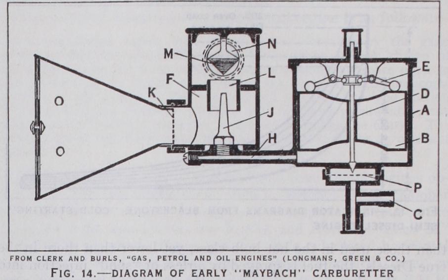 Maybach's famous "float-feed" carburetter, invented in was, however, found to supply a completely satisfactory practical solution of the problem of using successfully much heavier grades of petrol, and this, in numerous improved forms, is in universal use at the present time. A diagrammatic illustration of this cele brated device is given in fig. 14. Within the chamber A is a light brass or copper cylindrical float B which maintains at a con stant level the petrol supplied through C by its action on the central needle valve D through the weighted levers E. A small duct H maintains constant communication between the float chamber and the spray chamber F which contains the spray noz zle J within which the petrol rises nearly to the top when the engine is at rest. During the suction stroke air is drawn through the funnel-shaped intake 00 and gauze screen K, and passes up the Vend contracta or choke tube L surrounding the spray nozzle; in the choke tube the air velocity is great and its pressure in con sequence small ; the petrol accordingly issues from the nozzle in a very fine stream and, mingling with the air, is broken up into spray. This "atomization" and the subsequent vapourizing are assisted by impact upon a corrugated cone M, above the jet ; the mixture then passes on to the engine along an inlet pipe N, being usually adjusted on its way by admission of a regulated further quantity of fresh air. It is clear that by use of the spray nozzle all the fuel is used, and no selection of the more volatile constit uents is possible.