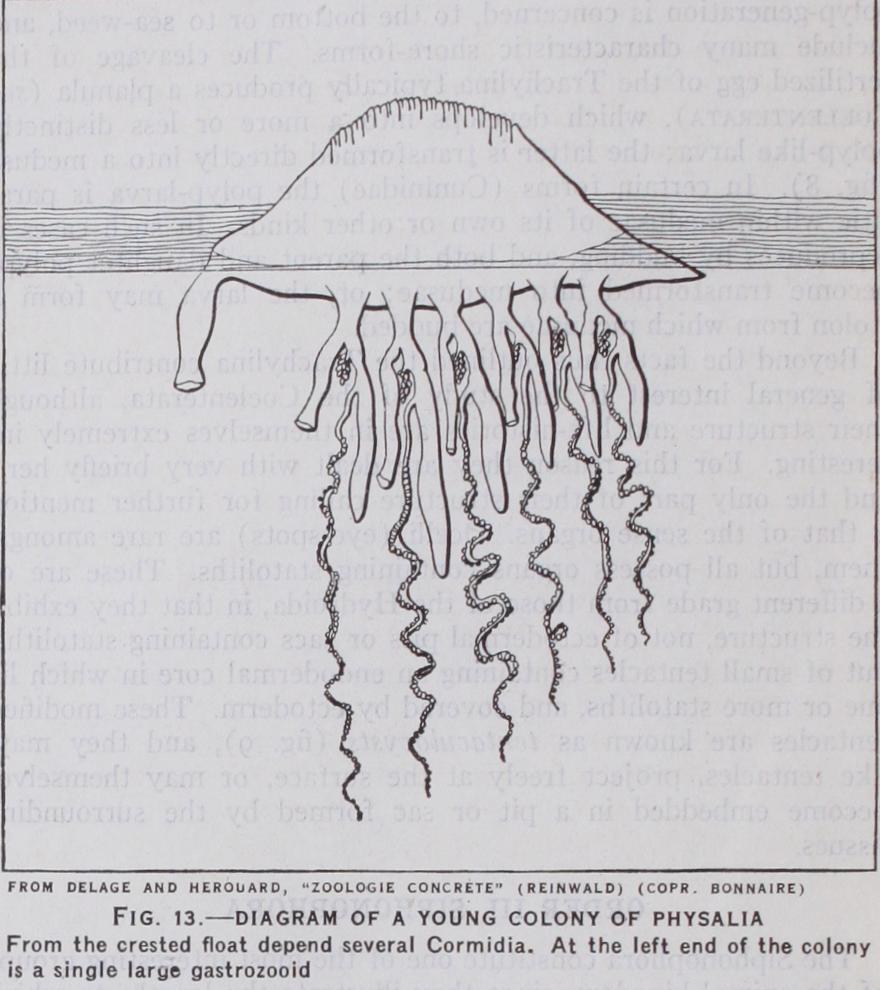 Here there are no longer any swimming-bells, but there is a large crested float opening to the outside by a pore, and bearing a gastrozooid at one end. In a young Physalia the underside of the float bears directly half a dozen cormidia, each containing a gastrozooid without a tentacle, a dactylozooid with a long unbranched fishing-line, and a branch ing blastostyle bearing small dactylozooids upon it, and also male and female gonophores. As the colony increases in size new indi viduals are added somewhat irregularly upon the stalks of the old, and the simple early arrangement is lost. The colours of Physalia (blue, orange, etc.) are of great brilliance, and it is a well-known denizen of the Atlantic, Pacific and Indian Oceans, often occurring in fleets, and commonly known as "Portuguese Man-of-War." One of its fishing-lines reaches a greater length than all the others, at taining more than a yard; and the stinging powers of these lines are extremely powerful, producing serious conditions after contact with them even in man. The colony is not bound to float at the surface; it can deflate the float and sink, reforming the gas within it and so rising once more, within a quarter of an hour.