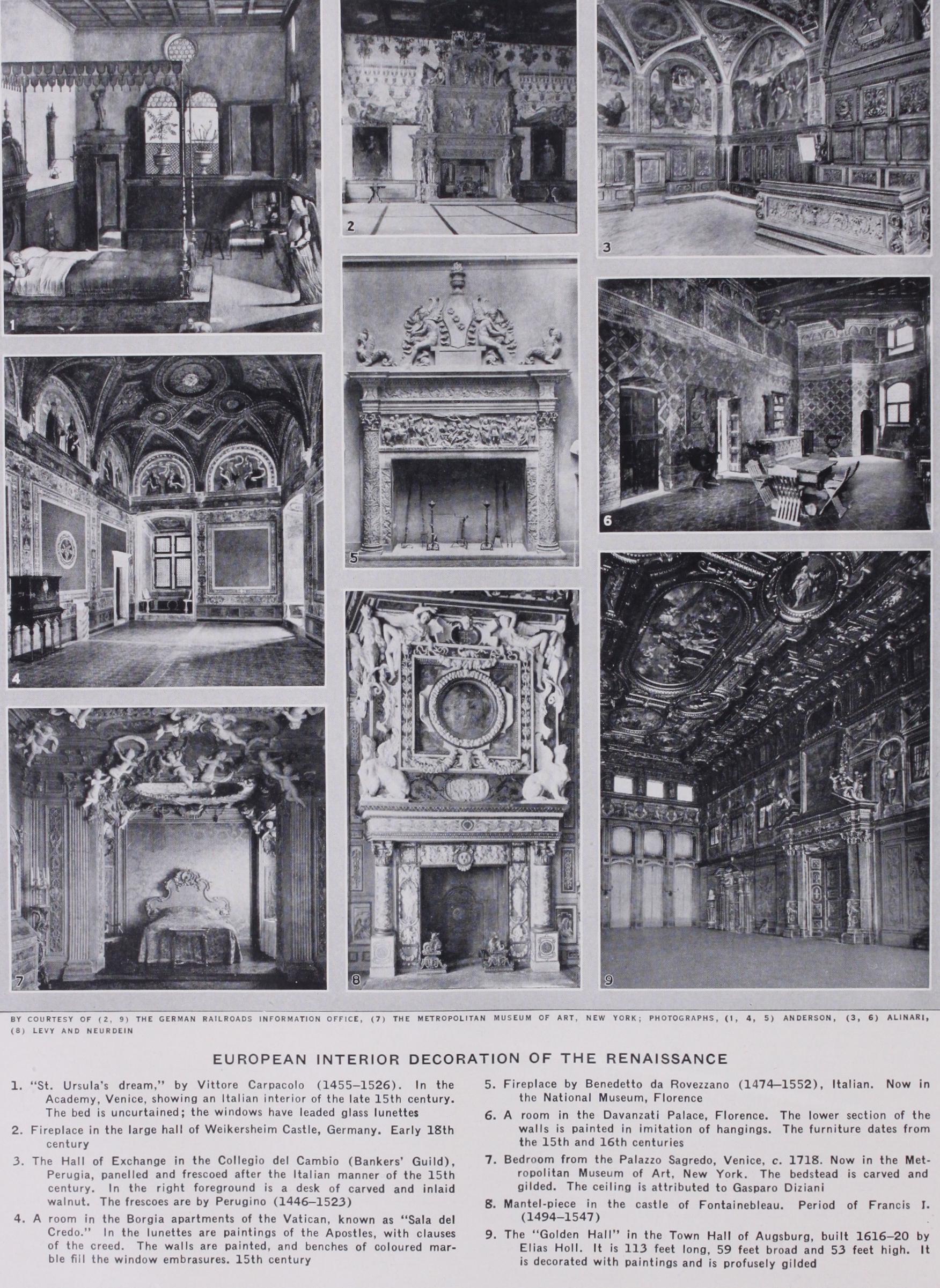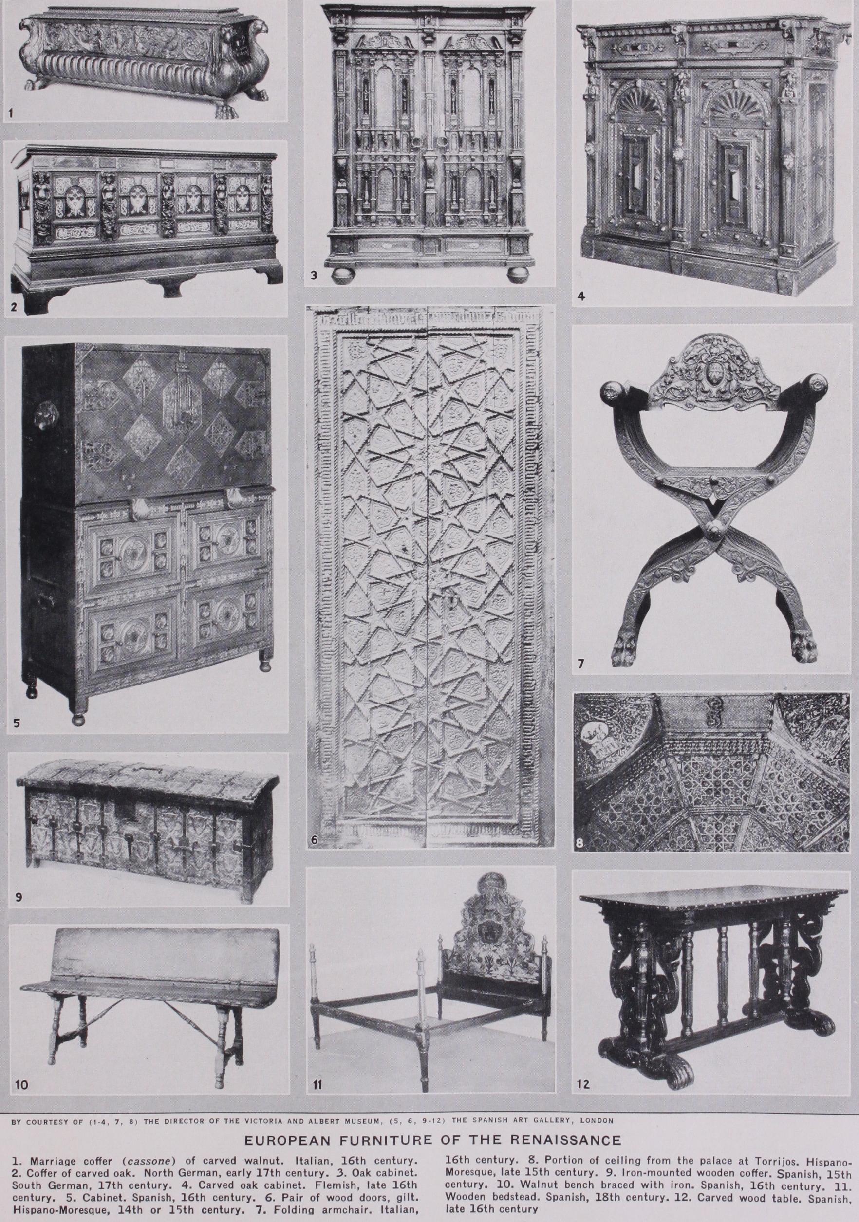 The Renaissance, which originated in Italy in the early years of the 15th century, gradually brought about a complete change in the domestic furniture of that country and of Europe. The class ical tradition had never been entirely lost in Italy. Traces of Roman greatness were to be seen in many places, though excava tion was only undertaken with the aim of obtaining building ma terials from the ancient ruins. When a deliberate return to old models was made, furniture gained an importance that it had not known hitherto. Columns, capitals, entablatures, pediments and other architectural features provided the skeleton of the structure, and the purpose of the cabinet or table, or whatever it might be, was subordinated to its form. The joiner borrowed from the architect. The furniture of the early Italian renaissance is often very restrained and beautiful. For the more elaborate kind of work, sculpture in low relief and stucco modelled in intricate patterns were much used. The stucco was usually gilt all over and picked out in colours. Such pieces became elaborate and costly works of art, though it must be admitted that they were a by product of the furniture-maker's craft. Carpaccio's painting of St. Ursula's dream, in the Academy at Venice, gives a most attrac tive idea, though in some measure fanciful and exaggerated, of an Italian interior in the last of the 15th century (Pl. II., fig. 1). The bed is of a form allied to the great panelled bed of northern Europe, but the heavy curtains are not required in a room flooded by the light and warmth of the early morning sun. There is a bench along one wall, an arm-chair, a stool and a low table. A cup board is let into the wall, and a smaller cupboard holds books and other articles. The ceiling is panelled and the windows are shut tered, with leaded glass lunettes above.