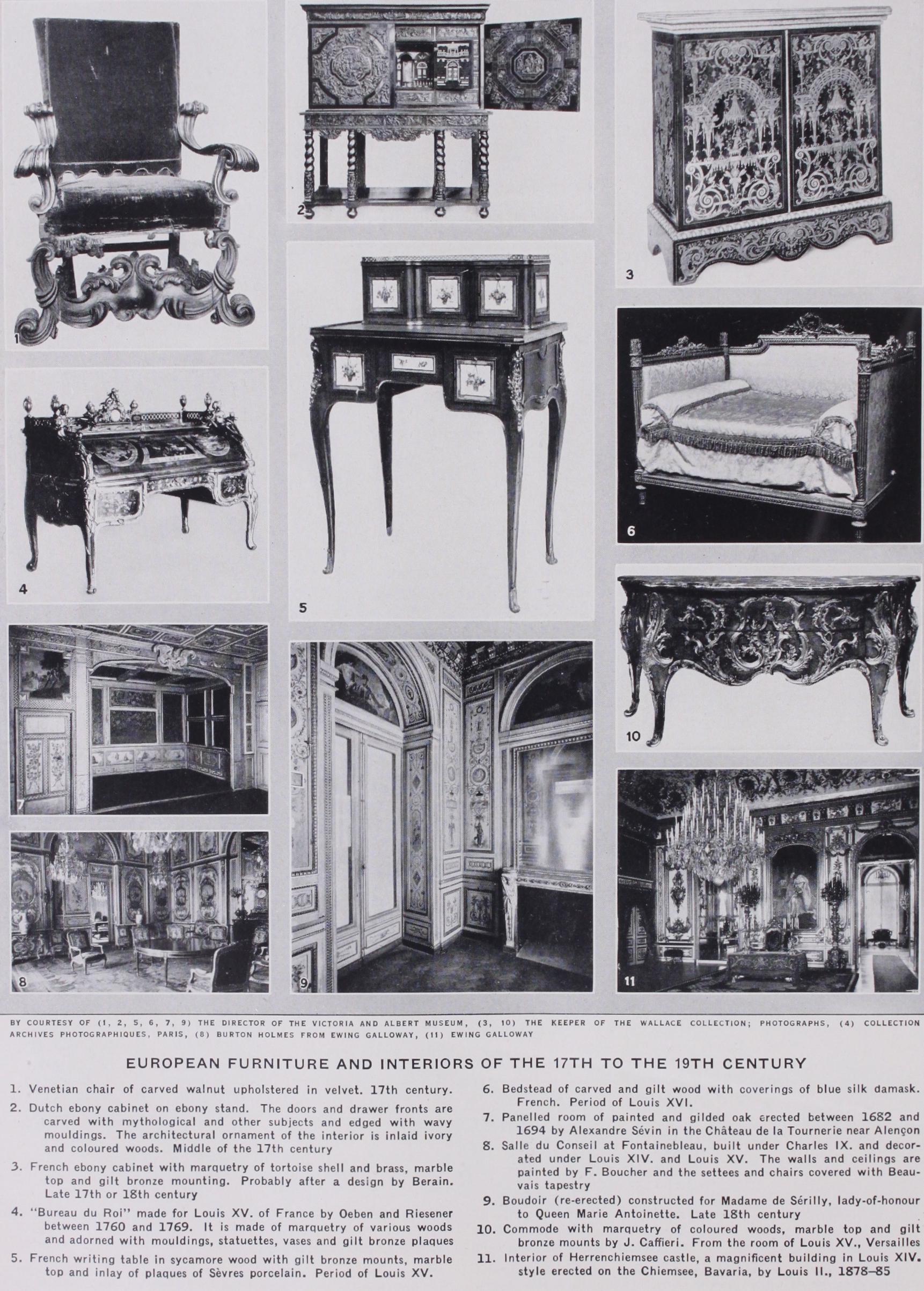 The Gobelins factory, which still remains a national establish ment, was founded under Louis XIV. for the production of meu bles de luxe and furnishings for the royal palaces and the national buildings. Charles Le Brun was appointed the first director of the Gobelins. Furniture was veneered with tortoiseshell or foreign woods, inlaid with brass and ivory, or heavily gilt all over. At times it was even completely overlaid with silver. The name of Andre Charles Boulle (q.v.) is particularly associated with this tendency. His cabinets and tables were completely covered by sheets of tortoiseshell and brass cut into intricate patterns so as to fit into one another, the tortoiseshell alternately forming the pat tern and the ground. (See INLAYING.) The light fanciful "gro tesques" of Berain were much used 'f or this work. Heavy gilt bronze mounts protected the corners and other parts from friction and rough handling. An example of this work, of a later period, in the Wallace collection, London, is shown in Plate IV., fig. 3. In ancient times, folding chairs might be of iron or bronze, and iron hinges and mountings have, of course, been used at all times where strength was required. The massiveness and elaboration of the furniture under Louis XIV. was followed by the rococo style of the regency in the first half of the 18th century. This style owes more to the influence of Chinese art than any other. The famous writing-table of Louis XV. (P1. IV., fig. 4), exhibited in the Louvre, was the work of the celebrated furniture makers, Riesener and Oeben. It is said to have taken nine years to make. Furniture under Louis XVI. showed some return to classical models. Curved surfaces were replaced by severer design,' and straight, tapering legs succeeded the cabriole. A limit of elegance unknown before was reached. Plaques of the delicate porcelain of Sevres, with ornament painted in brilliant colours on a dazzling white ground, were freely employed upon tables and cabinets (see Pl. IV., fig. 5). The gracefultapestries of the Gobelins and Beauvais replaced the heavy velvets of the 17th and early 18th centuries for upholstering chairs and settees and for window hangings. The bedstead shown (Pl. IV., fig. 6) is of carved and gilt wood, with coverings and canopy of pale blue silk. The French furniture of the 18th century set the standard of elegance and refinement for the whole of Europe.