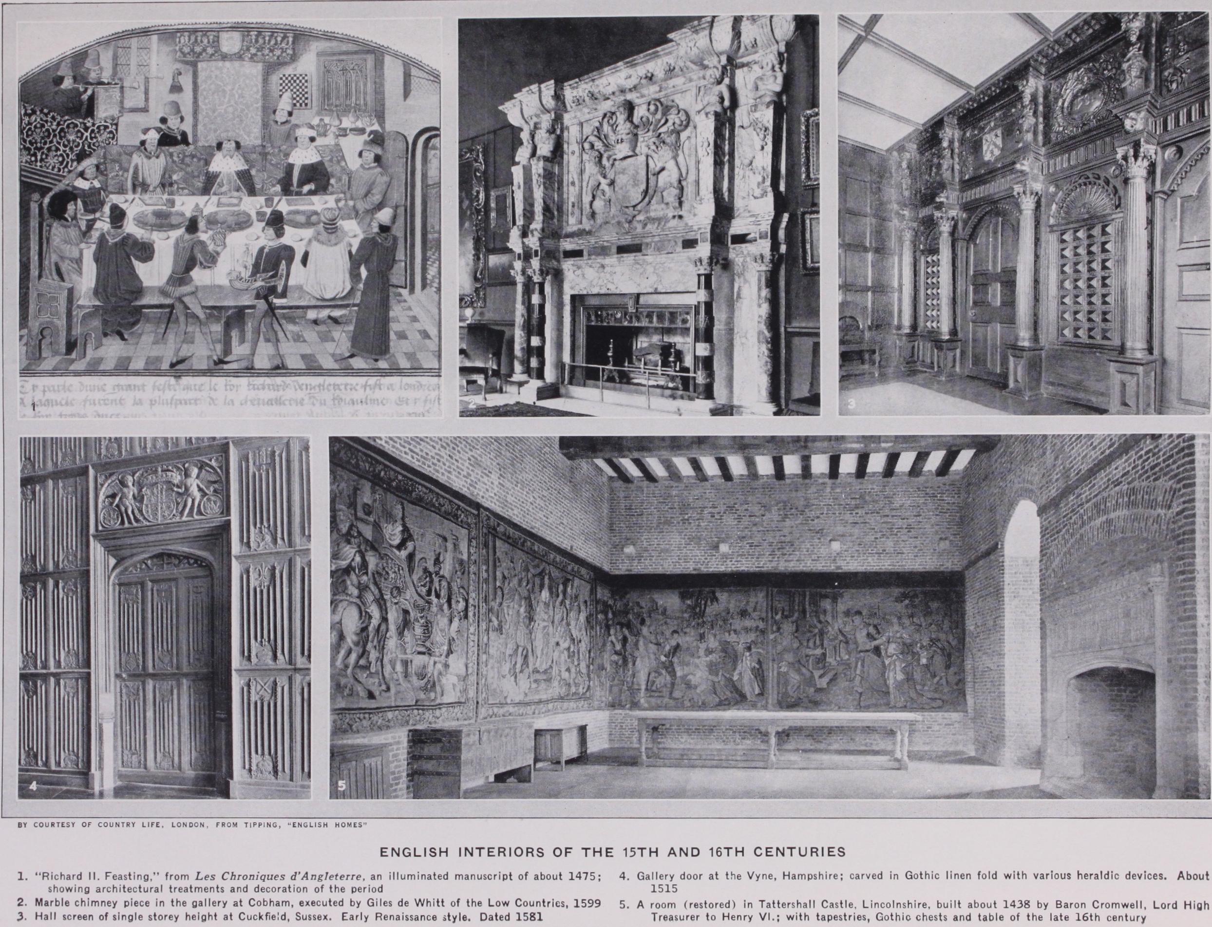 Flanders tapestries, known by the generic name of "arras," were the most favoured material. Solidly woven, they resisted the wear and tear of the movings of great men who had various estates but little gear. Tapestries were hung curtain-wise from wood-quartering set with tenterhooks, and such have recently been renovated at Tattershall castle, where, except for such hang ings, the brick structure of the walls was visible, as is seen also in a picture from an illuminated manuscript produced in Flanders for Edward IV. (c. 1475) of Richard II. feasting (Pl. V., fig. 1). There is no arras, but the king sits under a rich textile canopy, similar material also hanging in front of the musicians' stand. It was not as yet customary to have walls lined with oak, but it was used, and used richly, by the highly expert carpenters of the day for such structural purposes as hall screens and room parti tions. They had not, however, taken in hand the chimney-piece, which remained in the domain of the mason who in the 15th century bestowed pains upon its adornment, as we see in the great heraldically carved chimney-pieces at Tattershall, dating from about 1438.