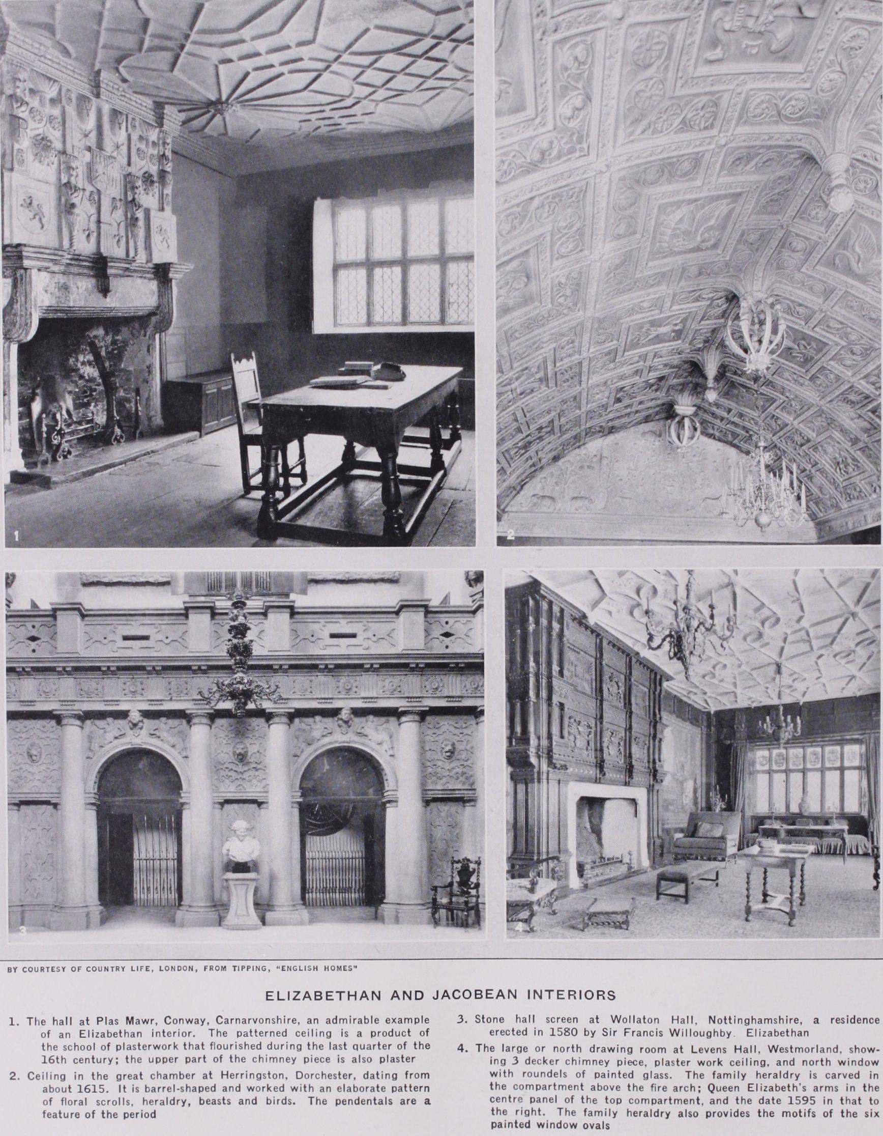 Plaster Ceilings.—Although wainscotings became the normal wall treatment under Elizabeth and her immediate successors, yet there was still scope for tapestry, and also for enriched plaster ceilings consisting of narrow interlaced ribs forming geometrical patterns. There are interesting examples at Plas Mawr in Con way, where the same material forms the upper part of chimney pieces, the royal arms indicating a date in Elizabeth's reign (Pl. VI., fig. 1). Such treatment of ceilings was often very elaborate in those distinctive Elizabethan rooms, the long gallery and the great chamber, which were often upstairs ; and greater height was obtained by using the roof space and forming a barrel-shaped ceiling. They exhibited not only the narrow ribbing of Elizabeth's time, but also the broad bands with enriched soffits that came in under James I., one of the finest examples of which is at Her ringston, near Dorchester, dating from about 1615 (Pl. VI., fig. 2).