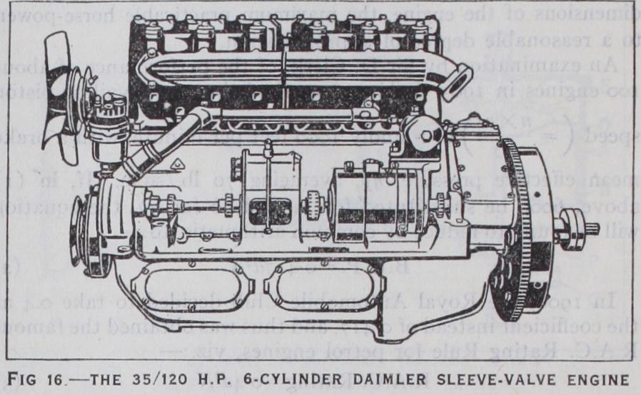 The Daimler-Knight Double-sleeve Engine.—Used with great success since 1908, the smooth running "Silent Knight" engine is deservedly famous. The four-stroke, single-acting, six-cylindered, h.p. design, illustrated in fig. 16, has a bore of 3.85 in. a stroke of 5.13 in., and consequently a Treasury rating of 35.5. Bench tests show that at a speed of 3,00o rev. per min. the engine develops roundly 120 b.h.r. At a car speed of 6o miles per hour the engine runs at 2,14o rev. per minute. The manner in which the ported light steel sleeves regulate the inlet and exhaust periods is clearly shown in fig. 17.