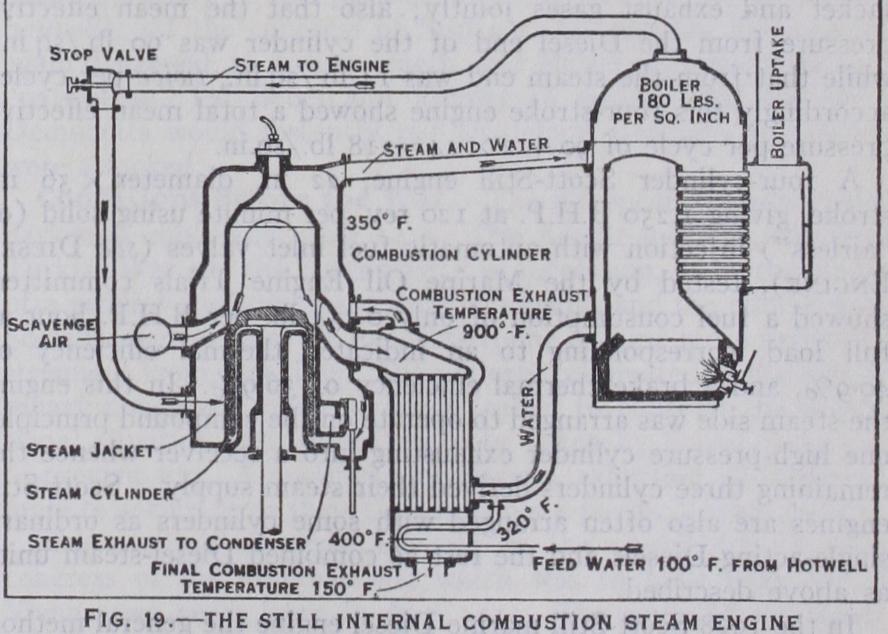 The method adopted is illustrated by fig. 19. Above the piston the usual Diesel sequence of operation is performed. The upper (Diesel) part of the cylinder is heavily water-jacketed, and the lower part is steam-jacketed; in the steam-jacket works a slide valve by which admission of steam to the lower end of the cylinder is regulated ; the exhaust steam from the cylinder passes into an ordinary condenser. The water-jacket is connected at its top with the upper part of an auxiliary oil-fired steam boiler (shown on right), and at its lower end, through a feed-heater, with the bottom of the same boiler. Through this feed-heater passes the exhaust from the Diesel end of the working cylinder, entering at a temper ature of, say, 900° F and leaving at the much reduced temperature of some 150° F only, thus giving up heat to the water system. This heated feed-water then enters the cylinder jacket, and receives some further heat by conduction through the working barrel, thereby rising in temperature to, say 35o° F. The water (and steam) circulation continues through the upper pipe to the auxil iary steam boiler, in which a pressure of 18o lb./sq.in. is shown.