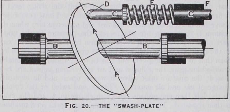 A plane disc fixed obliquely on a rotating shaft is an old mechanical device for obtaining reciprocating motion, and was illustrated and described as long ago as 1841 by Willis in his classic Principles of Mechanism wherein also it is shown that if the shaft rotates uniformly a simple harmonic motion of the reciprocating piece results. The device is illustrated in fig. 2o; AA is the "swash-plate" or "slant," mounted obliquely upon a shaft BB, and CC is a rod whose end is kept always in contact with the plate as indicated. Obviously, if the shaft BB rotates on its axis the rod CC will reciprocate. Conversely, if CC recipro cate,—and friction is not too great—it will communicate to BB an angular motion through a semicircle in making its stroke from right to left; by a second rod similar to CC, placed to the left of the swash-plate the shaft can be caused to perform a second semi circle, thus completing a revolution. This is the modes operandi of the swash-plate engine; CC becomes the piston and piston rod, the spring E the working impulse, and the bearing F the engine cylinder. Hydraulically-operated multi-cylindered swash-plate engines have been used for years in warships for training the big guns; these engines are both of single- and double-swash-plate design, the latter having two swash plates set back to back, con ferring valuable balancing qualities.