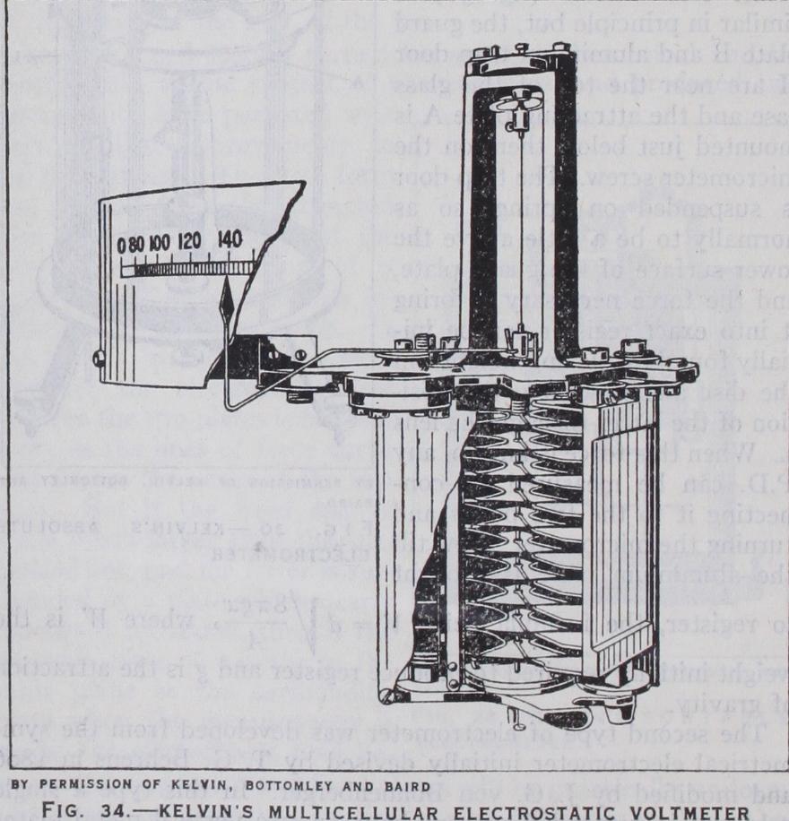 Lord Kelvin employed this principle in two forms of electrom eter, one of them being known as his portable electrometer, fig. 28, the essential parts of which are shown diagrammatically in fig. 29. H.H. is a plain disc of metal fixed inside the bottom of a glass jar, which is coated inside and outside with tinfoil to form a small Leyden jar. In the middle of this disc H.H. a square hole F is cut, and a slightly smaller square plate of aluminium foil provided with an arm at one side is mounted on a horizontal stretched wire so that it will just swing through the hole F like a trap door. The wire is given an initial twist so that the alumi nium plate normally rests a little below the upper surface of the disc H.H., and the arm which is provided with a crutch and cross wire is therefore tilted upwards. A circular plate G is fixed on the end of a micrometer screw above the disc H and is connected through the metal cover to the outer coating of the jar. When there is a difference of potential between the two coatings of the jar, and therefore between the two plates, the aluminium plate is attracted upwards and by varying the distance between the plates by the micrometer screw it may be made to come into exact regis ter with the plane of the disc H.H. when the indicating arm will be at zero. As the force required to attract the disc to this position is always the same, the P.D. re quired to obtain balance is simply proportional to the distance d between the plates which is indi cated by the reading on the head of the micrometer screw. The ab solute electrometer (fig. 3o) is similar in principle but, the guard plate B and aluminium trap door H are near the top of the glass case and the attracting plate A is mounted just below them on the micrometer screw. The trap door is suspended on springs so as normally to be a little above the lower surface of the guard plate, and the force necessary to bring it into exact register can be ini tially found by placing weights on the disc and observing the posi tion of the latter through the lens L. When this force is known, any P.D. can be measured by con necting it to the two plates and turning the micrometer screw till the aluminium plate is brought to register, the formula being V = d where W is the A weight initially required to produce register and g is the attraction of gravity.