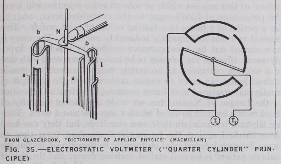 VIL ELECTROSTATIC INSTRUMENTS Electroscopes and Electrometers.—As their names indicate, these instruments are intended respectively for the detection and measurement of electric charges or differences of potential. troscopes were the first electrical instruments to be devised, and take their origin from William Gilbert (1544-1603 ), who first developed the knowledge of electrical phenomena from the isolated fact known to the ancient Greeks, that amber could be fied by friction. His electroscope consisted simply of a light pivoted metallic needle, either end of which was attracted on the approach of an electrified body. The next step was to utilize the repulsion of two similarly fied bodies. Benjamin Franklin, employing two linen threads hanging close together, and du Fay, Canton, Henley and Cavello double straw or pith ball scopes. Henley's electroscope (fig. 21) was a crude form of electrometer, and consisted of a pith ball suspended at the lower end of a light pivoted arm and normally just touching a metal sleeve. When the latter was charged, it imparted part of its charge to the pith ball and repelled it, and the amount of the charge was roughly indicated by an arc divided in degrees with its centre at the pivot. Cavallo's electroscope (c. 1770) was the prototype of the modern sion electroscopes, having a glass bell jar with a metal stem sealed into its neck (fig. 22). At the top of this stem was a shaped metal cap A, which served as a charging knob and also protected the glass and insulation of the stem from rain if the instrument was used in the open air ; while at the bottom of the stem two pith balls were suspended by fine silver wires. Two metal strips, B and C, were cemented on the inner surface of the bell jar and connected to earth. In 1782 Volta increased the sensitive ness of this form of electroscope by adding a condenser, and Fara day showed that for its indications to have a definite meaning the interior of the glass vessel should as far as possible be covered with metal, leaving only small spaces for the observations of the movements of pith balls. In 1787 Abraham Bennet substituted gold leaves for the pith balls, the form of electroscope shown in fig. 23, in which the stem carrying the gold leaves and charging knob is supported on a rectangular glass frame inside the bell jar which is coated on the inside by a number of strips T of tin foil, all connected to a terminal on the base, which can be connected to earth. The interior of the instrument is kept perfectly dry by means of a vessel containing cal cium chloride and sulphuric acid, and an ebonite plug slides on the upper part of the stem. This plug normally closes the jar, but when the instrument is in use, it is slightly raised, leaving a small air space between the stem and the cap of the bell jar.