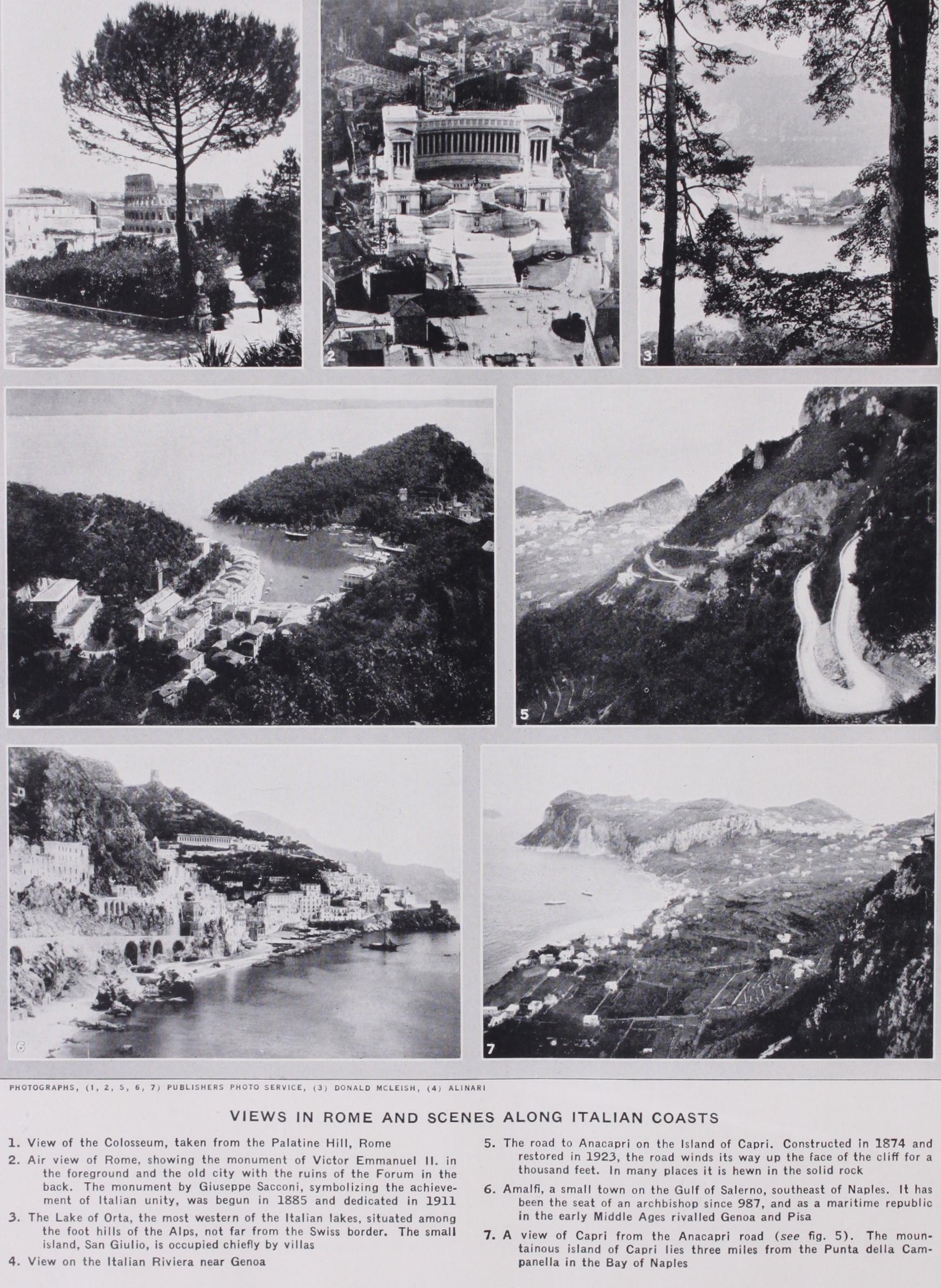 For the three great islands of Sicily, Sardinia and Corsica, see the separate articles. Of the smaller islands that lie near the coasts of Italy, the most considerable is that of Elba (q.v.). North of this, and about midway between Corsica and Tuscany, is the small island of Capraia (q.v.). Gorgona (q.v.), about 25 m. far ther N., is still smaller. South of Elba are the equally insignificant islets of Pianosa (q.v.) and Montecristo (q.v.), while Giglio (q.v.) lies much nearer the mainland, immediately opposite the mountain promontory of Monte Argentaro. The islands farther south in the Tyrrhenian Sea are of an entirely different character. Of these Ischia and Procida, close to the northern headland of the bay of Naples, are of volcanic origin, as is the case also with the more distant group of the Ponza islands (q.v.). The island of Capri, on the other hand, opposite the southern promontory of the Bay of Naples, is a precipitous limestone rock. The Aeolian or Lipari islands (q.v.), a remarkable volcanic group, belong rather to Sicily than to Italy.