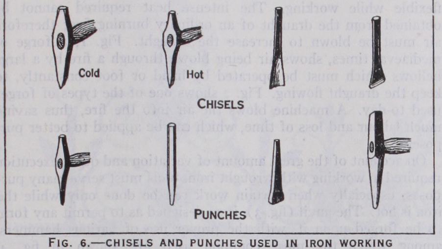 On account of the great amount of variation and quick execution required in working with wrought iron, tools must serve many pur poses, especially when certain work can be done only while the iron is hot. The anvil (fig. 3), is so designed as to permit any form to be forged upon it, with the proper use of various hammers, among which the most common used are shown in fig. 4. Wherever a strong grip is required to hold a tool or some smaller fragment of iron while working, the vice and different shaped tongs are used, as in fig. 5. There are also many kinds of chisels and punches, among which the most common are illustrated, and quite often it is necessary for the craftsman to make special tools for special occasions. Fig. 6 shows a few of these.