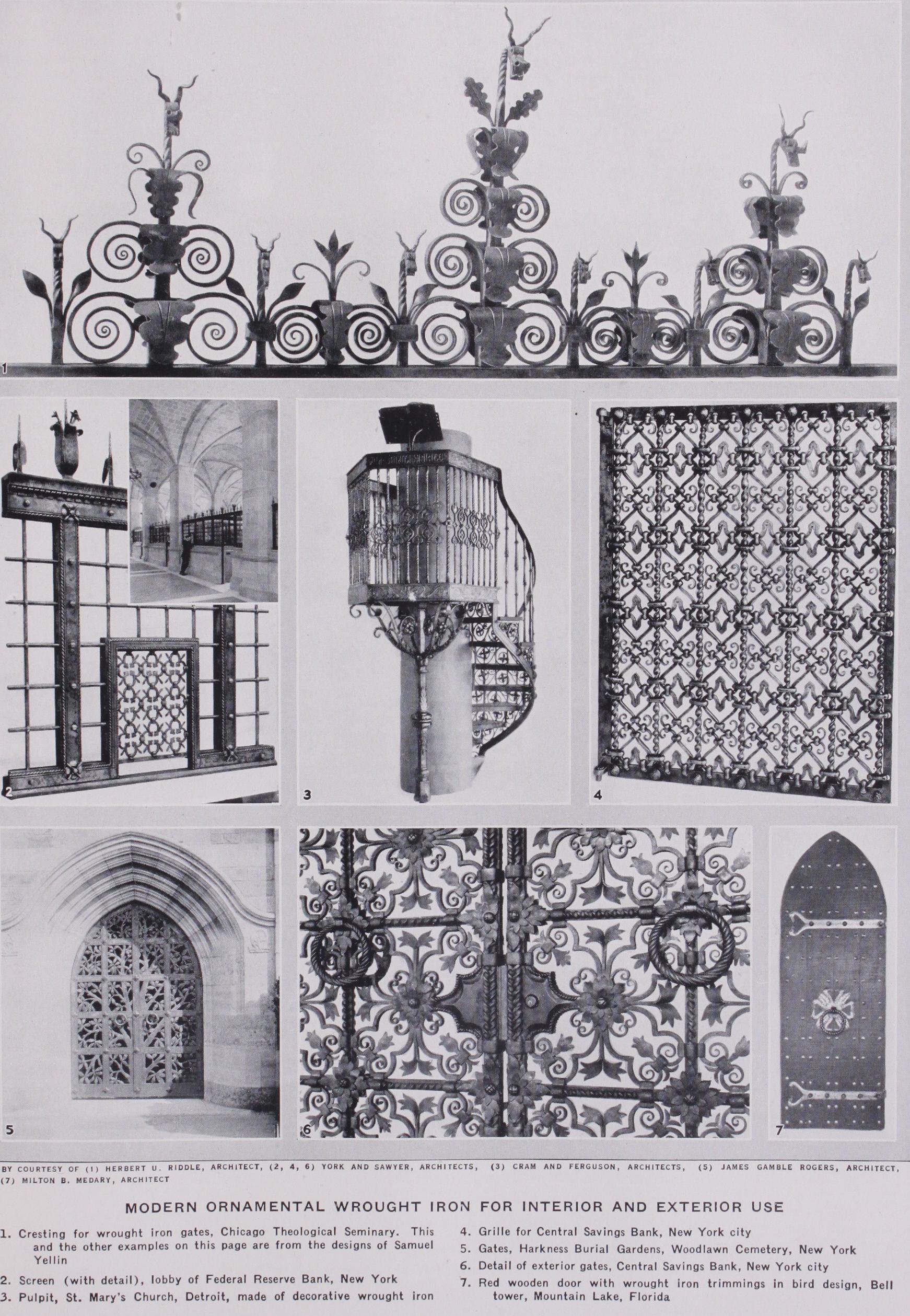 Iron not only suggests security, strength, defence and durabil ity, but lends itself to many beautiful and useful as well as ornamental purposes. But to-day these uses are being abused and ironwork is used promiscuously by those who try to establish a vogue in this craft. Much of the ironwork found on public buildings and in homes is for cheap show only, and little thought is given to the practical or decorative value of the work. A shop window may have a delicate grille or an ornamental gate, neither of which has any practical use whatsoever. It is conspicuously placed so as to attract the attention of the passer-by ; the iron work does not play into its architecture and is not in harmony with its surroundings.