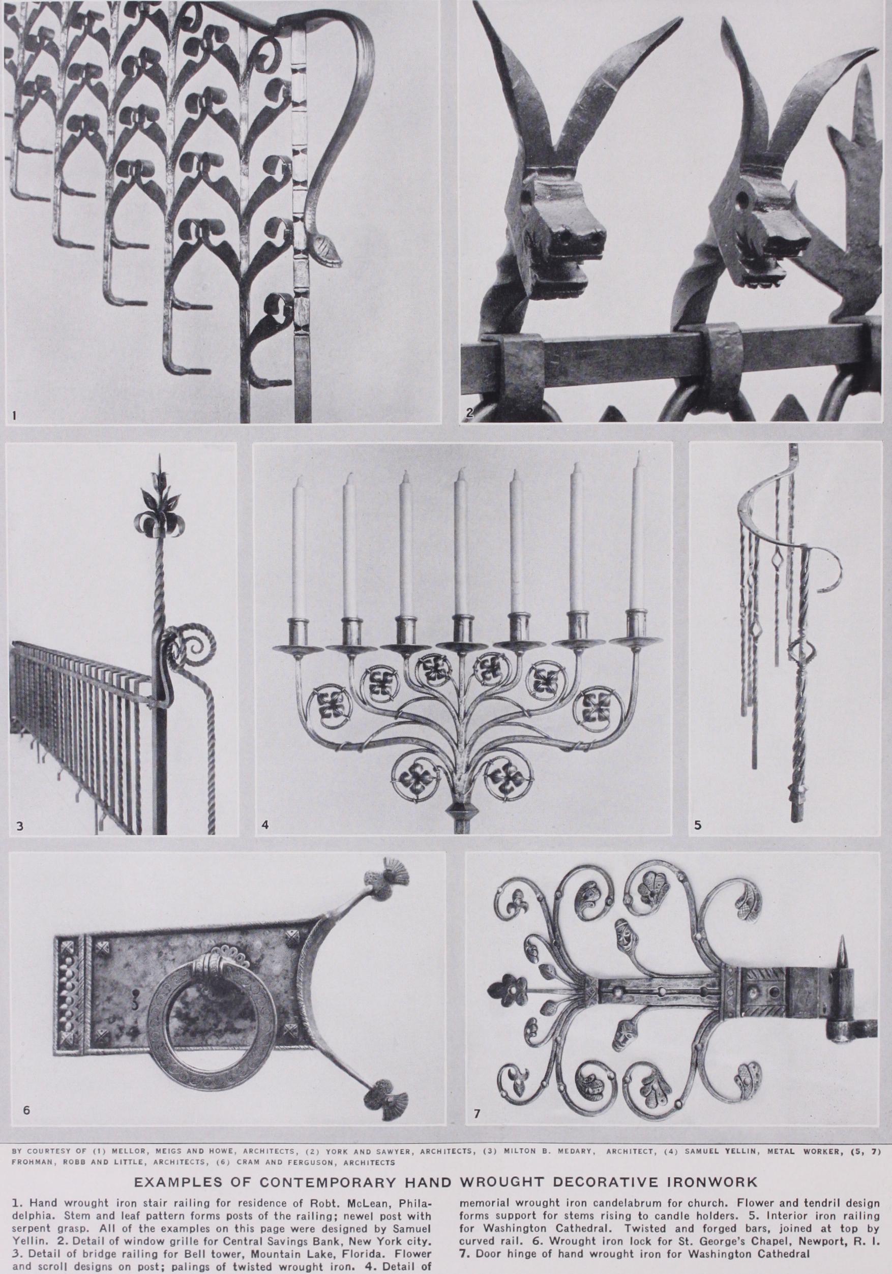 Although a metal worker is able to furnish drawings suggestive of the style, scale, proportion and general lay-out of the design, his real study of details can only be accomplished on the anvil. It is this actual study in the metal which gives the work its un expectedness and charm, and this can only come from a deep knowledge and love of the material. The making of beautiful ironwork cannot be fully described and illustrated on paper; it is often necessary for the craftsman to make sketches in iron, that is, make pieces in the actual material, before he illustrates on paper.