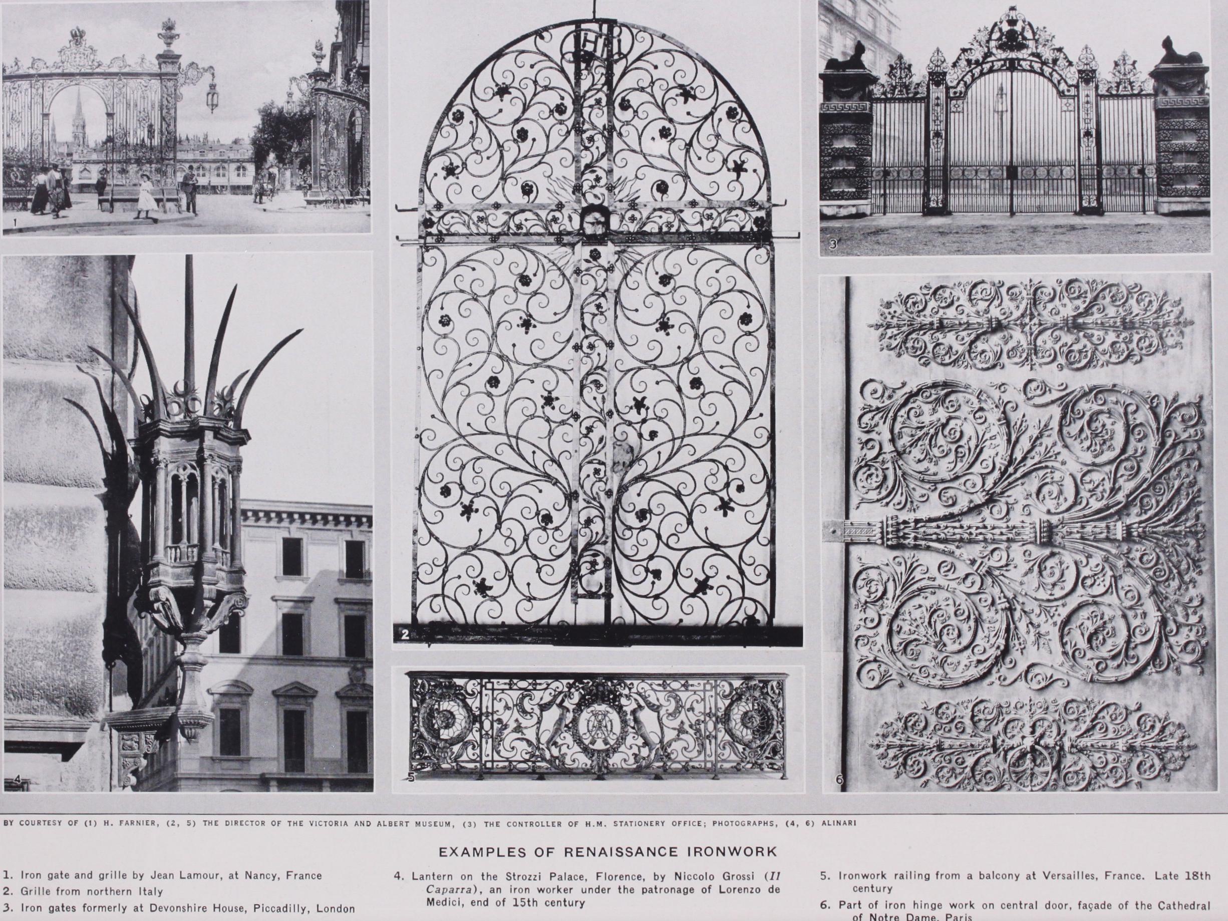 In screen-work the favourite motif was the quatrefoil which is found with many variations over a long period of time. Early examples are strong and virile, later ones tend to weakness. The C-shaped scroll is used in many combinations. The churches and palaces of Venice contain many examples. Peculiar to Italy are the lanterns and banner-holders such as may still be seen at Florence, Siena and elsewhere, and the rare gondola-prows of Venice. Of the ironworkers of the early Renaissance the most famous was Niccoto Grosso of Florence, nicknamed 11 Caparra be cause he gave no credit but insisted on money on account, who worked at the end of the 15th century. Vasari thus eulogizes him : "He was truly unique in his craft, and has never had and never will have an equal." From his hand is the well-known lantern on the Strozzi palace in Florence, repeated with varia tions elsewhere in the same city. Siena can show other lanterns and banner-holders attached to the facades of its palaces. Cres sets are still to be seen at Lucca and a few other towns. The Victoria and Albert museum, London, contains two gondola-prows in fine pierced iron. Through the i6th and 17th centuries Rome produced much good work of a more virile character than that at Venice, and the same may be said of other cities. To the in fluence of the Rococo movement reference will be made later.