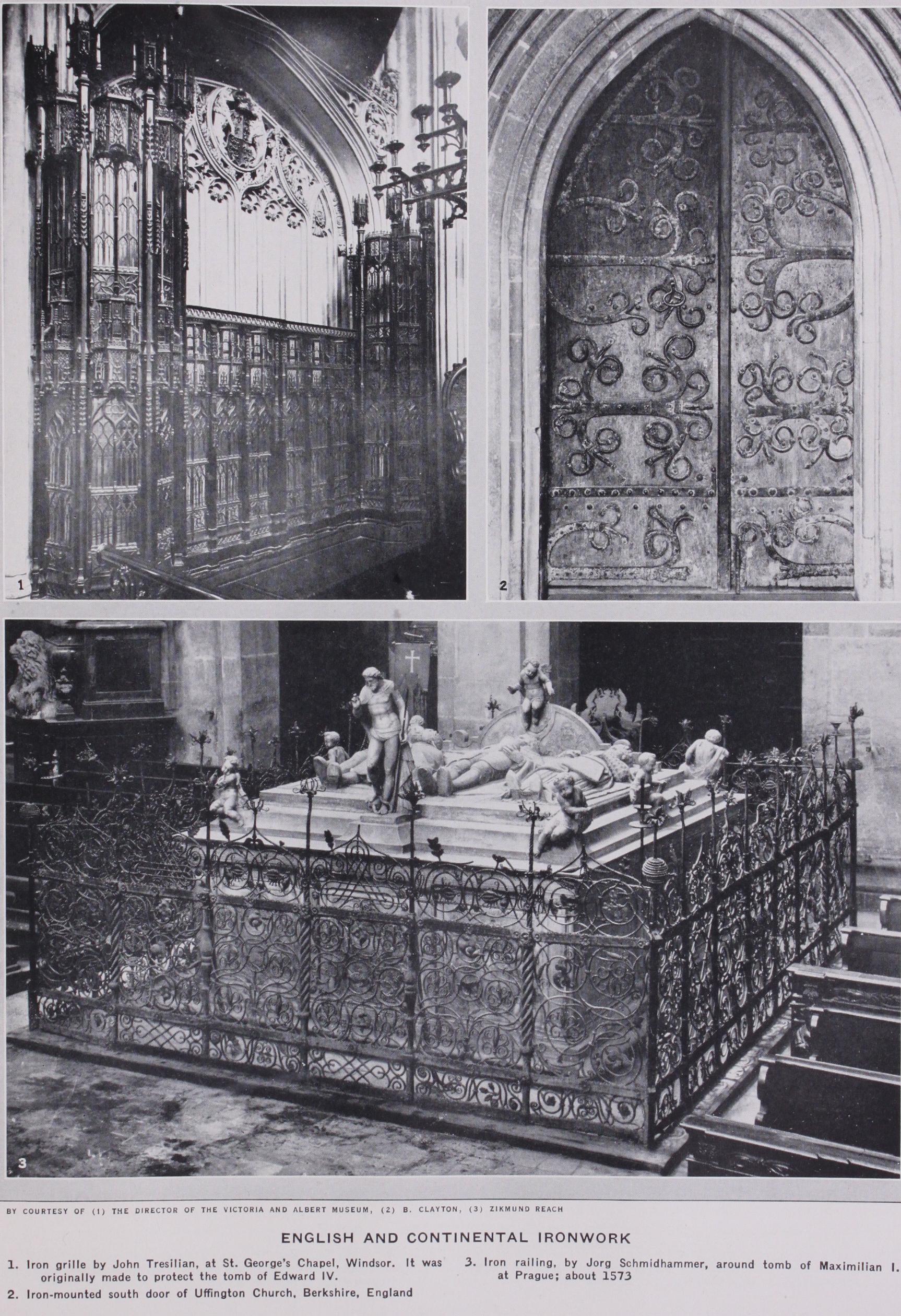 THE MEDIAEVAL PERIOD the Loth century iron-working among the English was as fully developed as at any time during the next three centuries. It appealed to the sturdy English temperament as a difficult material calling for swift action ; it suggested strength, stability and protection, all of which qualities were in those days not to be ignored. Its first use was purely protective; enemy attacks were frequent, and doors had to be strengthened with massive iron-work inside and out. Window openings, espe cially those of the treasuries of mansions and cathedrals, were filled with strong interlacing bars of solid iron; a good example remains at Canterbury cathedral. When in course of time the need passed away, there came greater freedom of work and a definite intention of ornament. Throughout England, church doors are found with iron hinges, the bands worked in rich ornamental designs of scroll-work, many of them probably the work of local smiths. They vary from the plain hinge-band with crescent to the most elaborate filling of the door. Examples exist at Skipwith and Stillingfleet in Yorkshire, many in the Eastern counties and others in Gloucester, Somerset and the west Midlands. The next movement came with the erection of the great cathedrals and churches, whose shrines and treasures demanded protection. Winchester cathedral possesses the re mains of one screen with a symmetrical arrangement of scroll work. The grille above the tomb of Queen Eleanor at West minster Abbey recalls the maker Thomas de Leghtone, a master craf tsman in iron who had succeeded another great smith, Henry of Lewes. Tombs were enclosed within railings of vertical bars with ornamental finials at intervals, such as that of the Black Prince at Canterbury. A third development appeared ;n the early years of the 14th century when the smith, working in cold iron, attempted to reproduce Gothic stone tracery in metal. This work was more like that of a joiner than of a smith, being often in small pieces chiselled and riveted, and fixed on a background of sheet-iron. A typical example is in Henry V.'s chantry at Westminster Abbey ; but the most magnificent is the great grille at St. George's chapel, Windsor, made to protect the tomb of Edward IV. For many years it passed as the work of the Fleming, Quentin Matsys, but it is now known to have been executed by an Englishman, John Tresilian. Many small objects such as door-knockers, handles and escutcheons are to be found executed in the same manner. Smithing declined in England during the i6th century.
