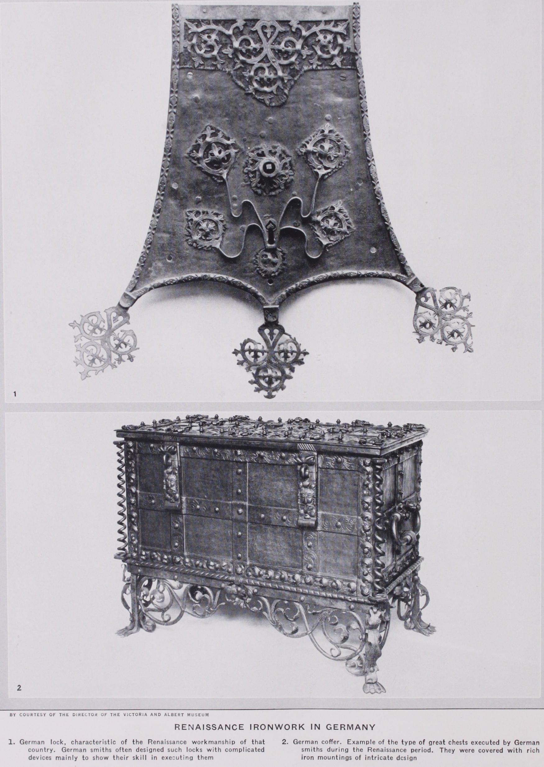 The German blacksmith gave much attention to door-knockers and handles, enclosing them in pierced and embossed escutch eons, also locks of very involved mechanism. Mention must also be made of the great boxes erro neously termed "Armada" chests, sometimes covered with rich iron mountings and having a lock with many bolts spreading over the whole of the inside of the lid.
