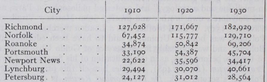 lation over 10 years of age amounted for the State as a whole to 8.7; among the native whites it was 4-8%; among the negroes 23.5%. The proportion of the population living in cities of more than 2,500 inhabitants increased from 18.3 in 190o to 23.1 in 1910 and 32.4% in 1930. The chief cities with their population according to the 191o, 192o and 193o censuses, are given in the following table : Government—Virginia has had six State Constitutions : the first was adopted in 1776, the second in 183o, the third in 1851, the fourth in 1864, the fifth in 1869 and the sixth, the present, in 1902. Amendments to the present Constitution may be proposed in either house of the general assembly, and if they pass both houses of that and the succeeding general assembly by a majority of the members elected to each house and are subsequently ap proved by a majority of the votes polled at the next general election they become a part of the Constitution. A majority of the members in each house of the general assembly may at any time propose a convention to revise the Constitution and, if at the next succeeding election a majority of the voters approve, the general assembly must provide for the election of delegates. To be entitled to vote one must be a citizen of the United States and 21 years of age; have been a resident of the State for one year, of the county, city or town for six months, and of the election precinct for 3o days next preceding the election.