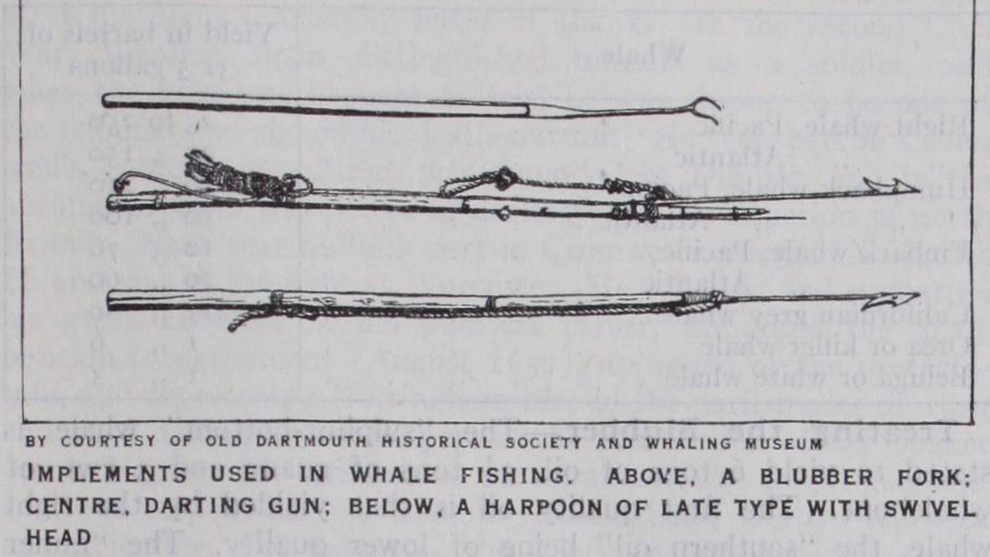 Whaling in the main Atlantic, the Pacific and the Antarctic was developed chiefly from the Newfoundland ports, and from Nan tucket and New Bedford. Before 1700 the industry had passed through most of the coastal stages. Part was taken in the Green land fishery, and from the capture of a sperm whale (Physeter catodon) offshore in 1712, American whaling spread down the whole length of the Atlantic, and before 1800 had reached the Pacific. The industry grew rapidly and was well established by the Revolution. Notwithstanding the vicissitudes of wars, from which American whaling suffered, perhaps, even more than did the European industry, a marked power of recovery was always shown. Shortly before 185o the fleet numbered 68o sail in all; and all but 40 odd ships were employed in the Pacific in the pursuit of sperm and right whales. About the same date the right whales found in the neighbourhood of Bering strait, the bowheads, were hunted for the first time. The value attached to sperm oil, which was used for both ointments and candle making, had much to do with this development. A similar recovery followed the American Civil War; but the use of petroleum for lighting, and the more con stant prospects offered to capital in other industries, caused American whaling to dwindle away. By 190o the sperm whaling was nearly entirely dead, and the main whaling that of the small fleet following the bowhead. The grey whale, Rhacinactes glaucus, was also hunted in the lagoons of the western coast, but did not long en dure the destruction. In the fisheries of the open sea mentioned above (all south of the Arctic) Great Britain took an active part. They were first in the Pacific and predominated for a time in the Indian ocean ; their participation, however, began in 1775 and lasted less than a century. The hardships of these fisheries, known collectively as the Southern Whaling, must have been extreme. The ships were away three or more years and provisioned accordingly. Their crews must endure and work in tropical conditions, and in the rigorous climate of South Georgia and even of more southern latitudes. The attack by open boats (though usually four worked together) in mid ocean, with the added possibility of being towed out of sight of the mother ship, and the risk of fire in such whalers as tried out the blubber on board, must have made the calling hazardous in the extreme.
