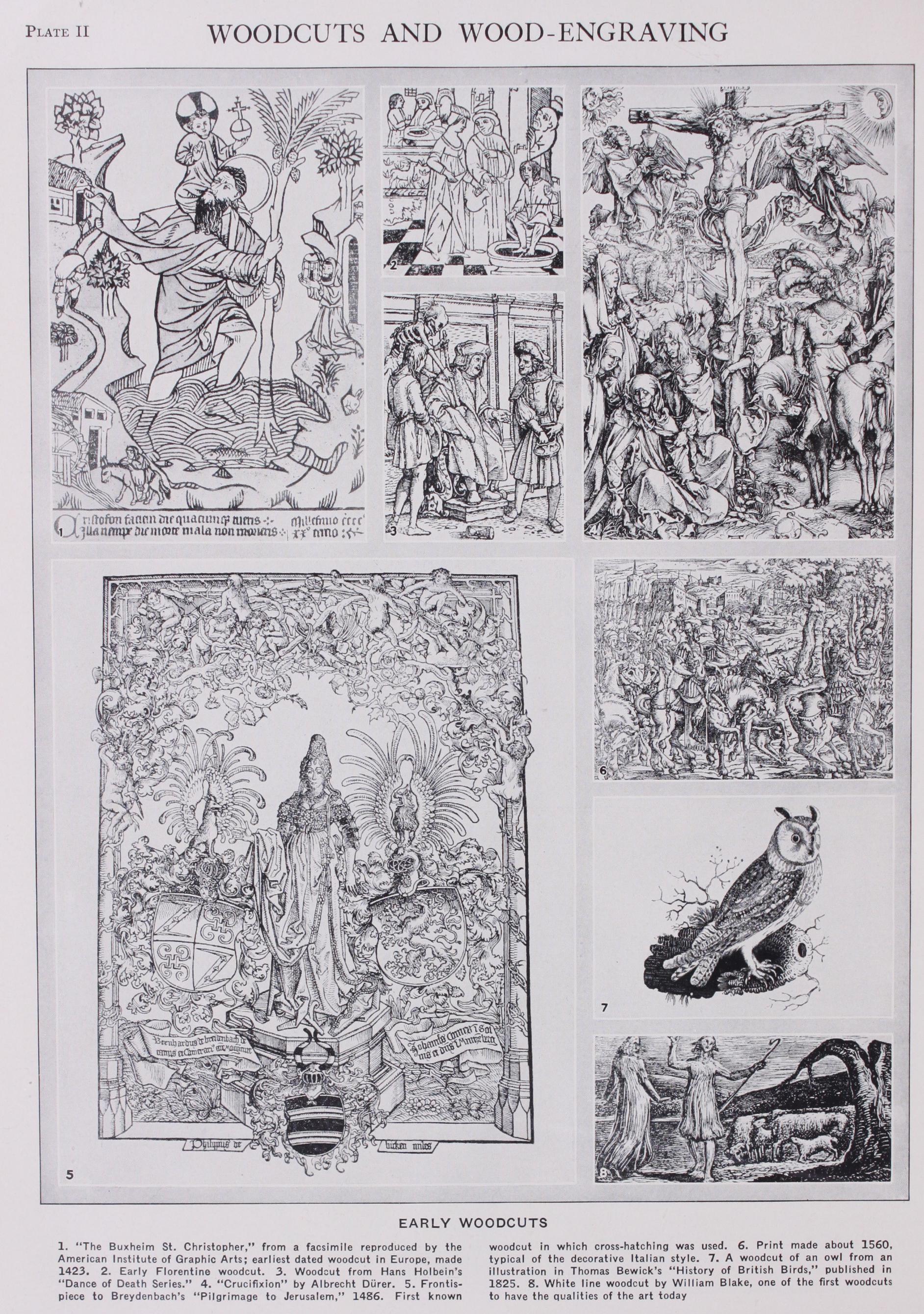 Technically speaking the woodcut is pictorial type. It prints pictures as type prints letters of the alphabet, by raised lines or areas that catch ink from a roller and deposit it on paper under moderate and more or less even pressure. This analogy roots in history as well as fact. The first printed letters were woodcut type carved into pictorial woodcut blocks in explanation of the picture. The first movable type was a cutting up of this block type in order to save labour by rearrangement and re-using. The woodcut raised line is the opposite of the intaglio, or sunken line, which is etched or engraved on copper. (See INTAGLIO.) In the print etched or engraved lines catch the light and cast minute shadows, thus giving a life or sparkle to the work that is impos sible with any other mediums. The woodcut gives a flat surface print, with an interplay of solid black and white, and a slightly varying texture and intensity that is quite unique.