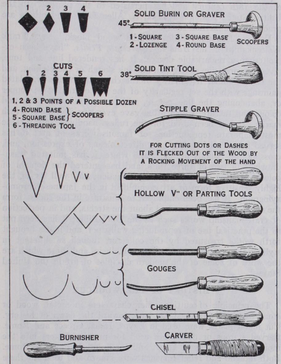 When two lines are close together and parallel the sloping cuts on adjacent sides of each would remove a V-section between them. This V-cut can be made with one stroke instead of two by using the "V" or parting tool shown in fig. 1. Larger areas are