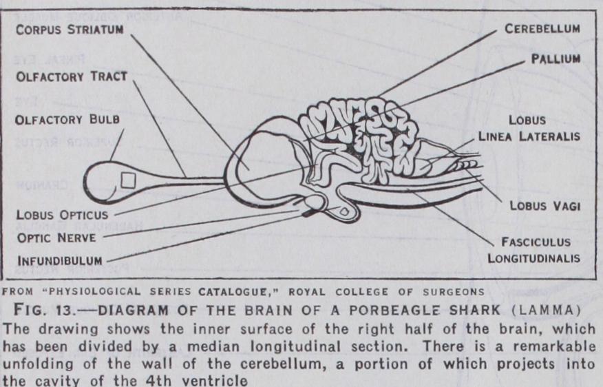 Fishes.—In the Selachia, viz., cartilaginous fishes, such as sharks, dog-fish and skates, the evolution of the brain is still fur ther advanced (fig. 13) . The development is chiefly in the tory part of the brain and the cerebellum. Although the eyes are fully developed, smell is probably the dominant sense, since the olfactory bulbs and tracts are enormous and project as large hollow outgrowths from each side of the forebrain. There is also a remarkable development of the cerebellum, more especially in the Porbeagle shark (Lamna), in which the cerebellar cortex is highly convoluted. The cerebral hemispheres are much larger than in the lamprey, the corpora striata are developed, and a roof plate or pallium is present; but as yet there is no differentiation of cortical layers. There is only one pineal stalk. The fibres of the optic nerves cross one another without intersection of fibres.