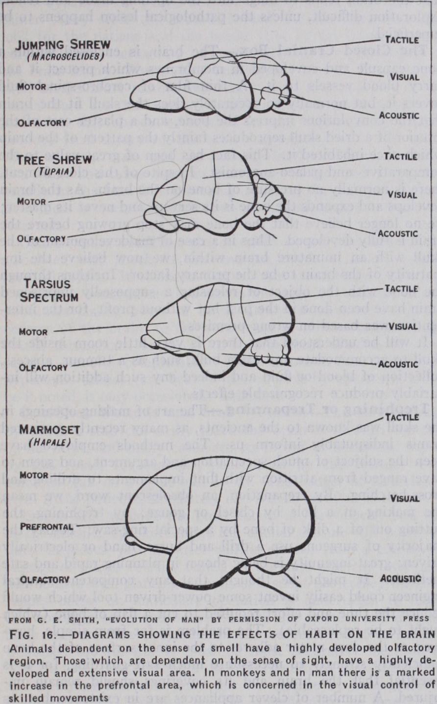 The Insectivora are remarkable for the very large size of their olfactory organs. In the mole the optic nerves and tracts and the superior corpora quadrigemina are poorly developed. The influ ence on the brain of change of habit in two members of the same family, the jumping shrew and the tree shrew, is strikingly de picted in the illustrations (fig. 16). (G. Elliot Smith, Essays on the Evolution of Man [1927].) The accompanying drawings of the brains of higher mammals, Tarsius spectrum and the marmoset, show the increase in the visual, acoustic and tactile areas which has taken place in these animals, and especially in the latter, of the prefrontal and association areas.