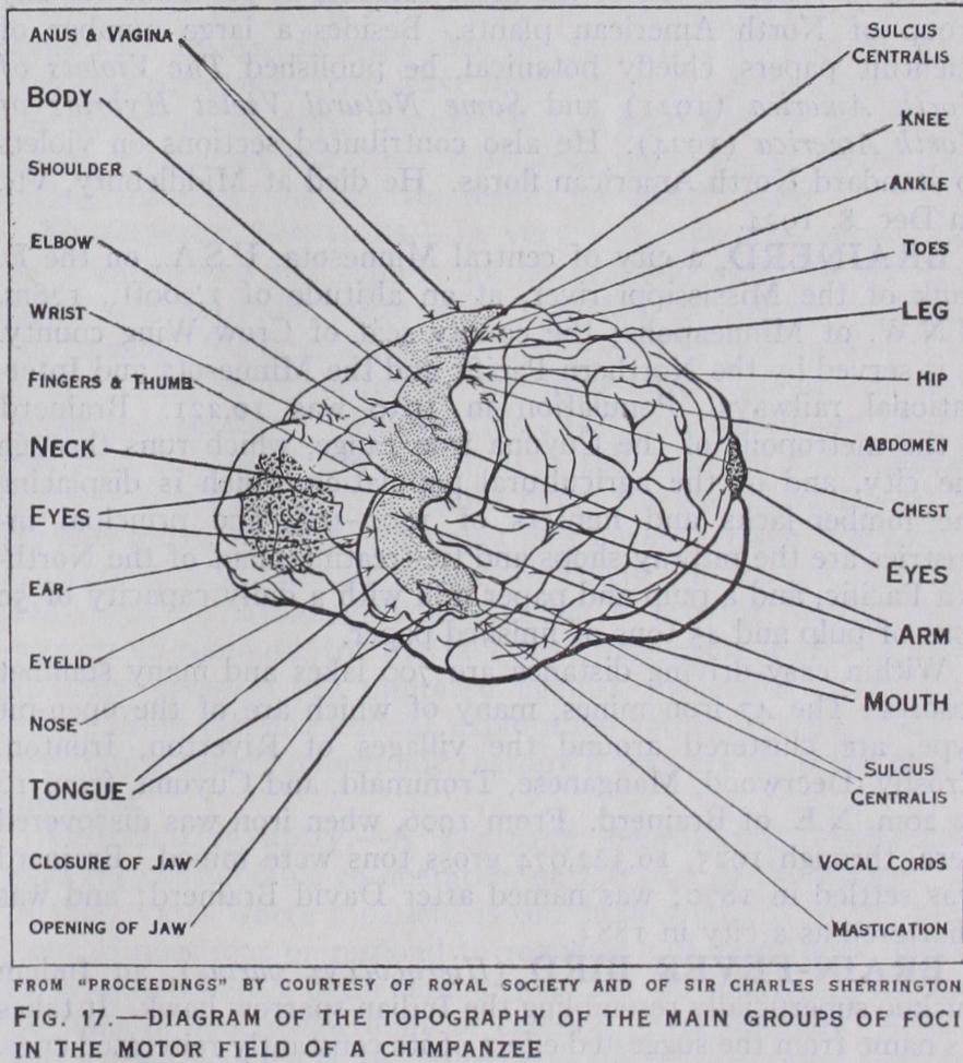 The central fissure marks the posterior limit of the important motor area of the cortex (fig. 17). Electrical stimulation of par ticular parts of this area produces definite movements of groups of muscles, the action of which is normally initiated and controlled by the part stimulated. Injury to the same part causes paralysis of the corresponding muscles. The cortex of the occipital lobe which surrounds the posterior part of the calcarine fissure is the visuo-sensory area for reception of visual impulses from the retina. The visuo-sensory area is surrounded by a marginal zone which extends on to the outer aspect of the occipital lobe, termed the visuo-psychic area. (See VISION.) The middle part of the first temporal gyrus and the adjacent gyri on the lower lip of the fissure of Sylvius are concerned with hearing (fig. 7). The auditory area of the brain receives sen sory impulses by way of the auditory radiation from the inferior corpus quadrigeminum and internal geniculate body of the same side. These, the lower auditory centres, are connected with the opposite ear by means of the lateral fillet.