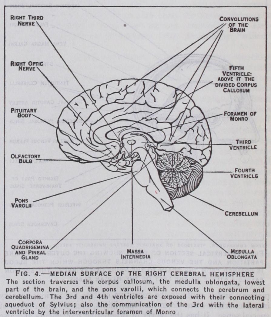Ventricles.—These are cavities containing fluid situated in the substance of the brain and lined by a thin membrane, the ependyma. The true ventricles are four in number, namely, the right and left lateral ventricles, which are contained in the cerebral hemispheres; the third ventricle, situated between the optic thalami, and the fourth ventricle in the hind brain. Each lateral ventricle is connected with the third ventricle by a small opening, the interventricular foramen of Monro ; and the third ventricle is joined to the fourth by a narrow channel, the aqueduct of Sylvius (fig. 4). The fourth ventricle communicates below with the central canal of the spinal cord and with the subarachnoid space by the foramina of Magendie and Luschka.