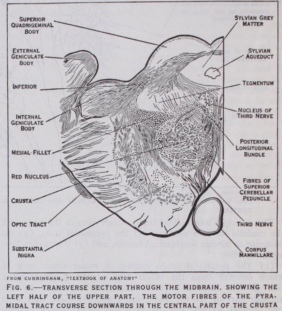 The part of the midbrain which lies ventral to or below the aqueduct forms the crura cerebri. These are two diverging limbs which ascend from the pons Varolii to the right and left cerebral hemispheres (fig. 9). The superficial part (crusta) of each crus, (fig. 6), consists of motor and sensory nerve fibres. The former constitute a part of the great pyramidal tract which descends from the motor area of the cerebral cortex to the opposite side of the spinal cord. The sensory fibres pass from the frontal and temporal lobes to the pons, and thence to the opposite side of the cerebellum. Behind, or dorsal to the crusta, is a lamina of pigmented nerve cells (substantia nigra) which separates the crusta of one side from the corresponding side of the tegmentum. The latter con sists of two symmetrical halves, connected by a median raphe. This is traversed by decussating fibres, the greater number being the cerebellar fibres already mentioned as issuing from the dentate nucleus, travelling by the superior peduncle to the midbrain, and then crossing to the red nucleus of the opposite side (fig. 6).