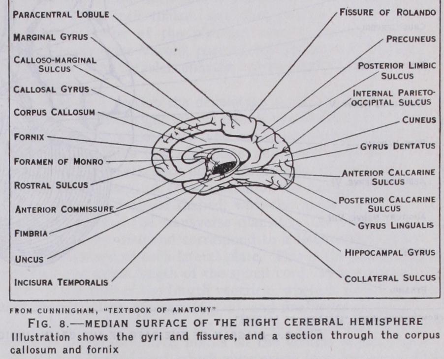 In the tegmental part of the midbrain are also situated the longitudinal association tracts, known as the anterior and posterior longitudinal bundles; and the fountain decussation of Meynert, which connects nuclei in the superior quadrigeminal body of one side with the nuclei of cranial nerves of the opposite side of the brain ; finally, the midbrain contains the nuclei and roots of origin of the third, fourth and part of the fifth cranial nerves, in the grey matter surrounding the aqueduct of Sylvius. (See NERVE.) Cerebral Hemispheres.—One of the most distinctive fea tures of the human brain is the large size of the hemispheres and the high degree of specialization in the microscopical structure of the cortex. The surface of each hemisphere is, for descriptive purposes, subdivided into lobes and lobules. Certain fissures and lines which are arbitrarily drawn between these are employed for demarcating the boundaries of these areas. The names of the principal fissures and lobes are indicated in figs. 7 and 8, and it will only be necessary to draw attention to certain of the more im portant. Thus the central fissure, or fissure of Rolando, is situated on the superficial surface and separates the frontal from the parietal lobe. The lateral fissure or fissure of Sylvius marks off the temporal lobe from the parietal and frontal lobes. On the median surface (fig. 8) are the calloso-marginal, the parieto occipital and calcarine fissures, which limit the frontal, limbic, parietal and occipital lobes.