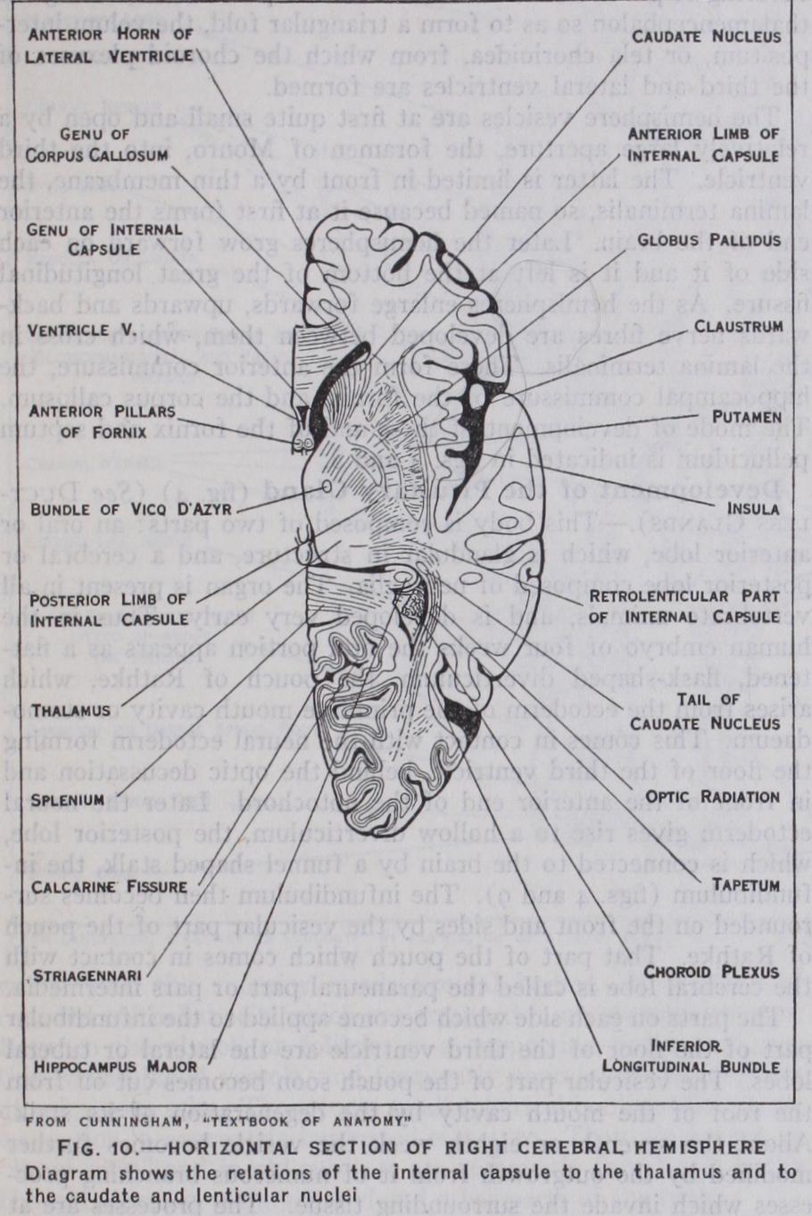The basal ganglia are three masses of grey matter embedded in the cerebral hemispheres (fig. 1o). The basal ganglia consist of the optic thalami, the caudate and lenticular nuclei. The optic thalamus is a receptive centre for primary sensory impulses, and an important cell station in the path of sensory fibres to the cere bral cortex. The caudate and lenticular nucleus, with the white matter which surrounds the lenticular nucleus, form the corpus striatum. The white fibres lying to the inner side of the lenticular nucleus are called the internal capsule, those to its outer side form the external capsule. The former consists of sensory fibres pass ing to the cortex, motor fibres of the pyramidal tract passing from it, and association fibres passing between the nuclei.