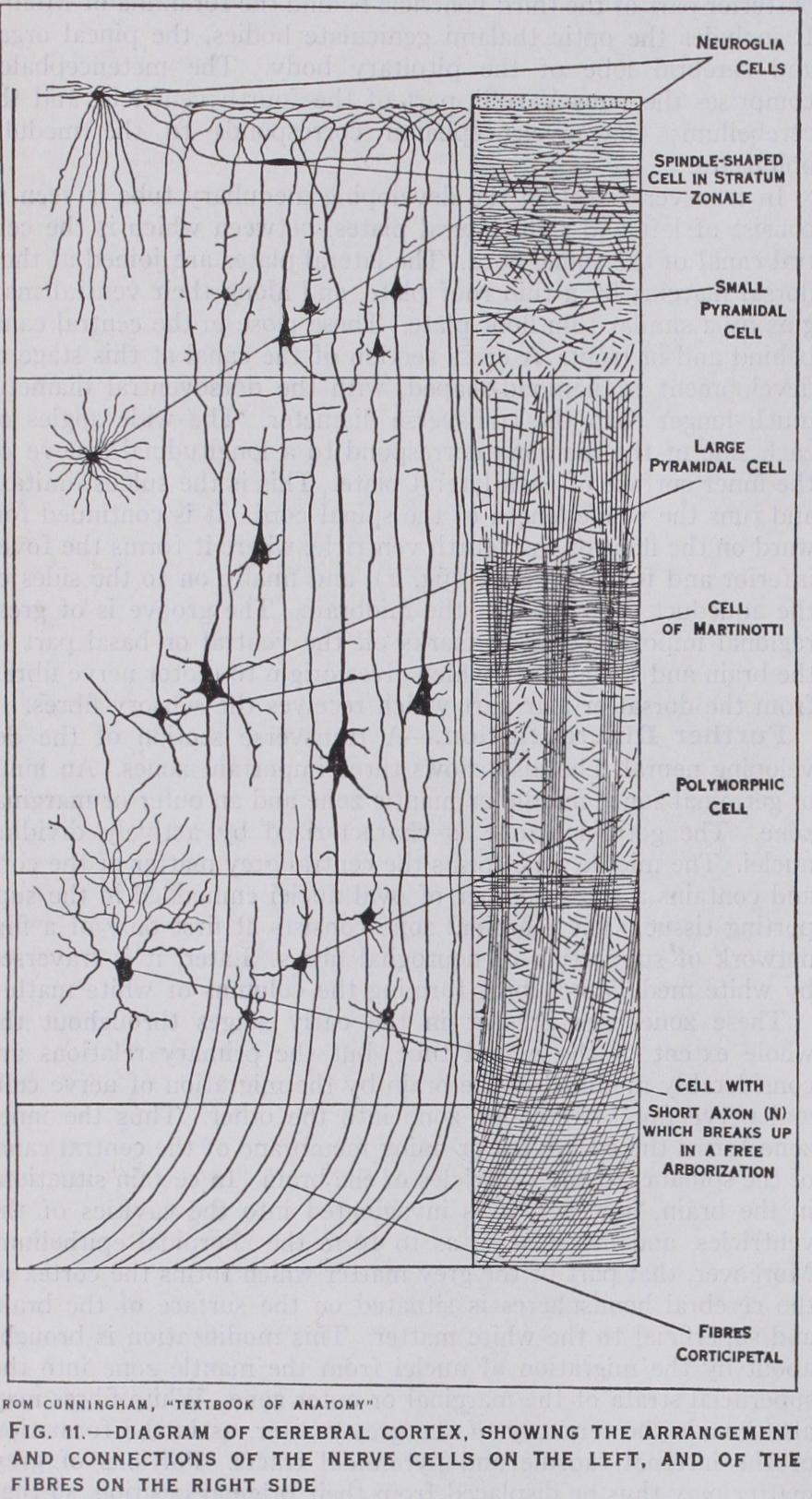 It exhibits a definite stratification into layers of nerve cells and nerve fibres. In sections of the fresh brain, the main strata are easily recognizable by the unaided eye, and more especially so in the visual cortex, or area striata. Various zones may be distin guished in this way, and it is found that the naked eye appear ances correspond closely with the finer details revealed by micro scopic preparations. A general idea of the disposition and appear ance of the cell elements and nerve fibres will be gained by refer ence to fig. I I, in which isolated cells are depicted on the left and the fibre systems on the right.