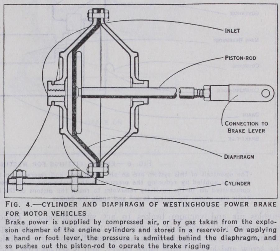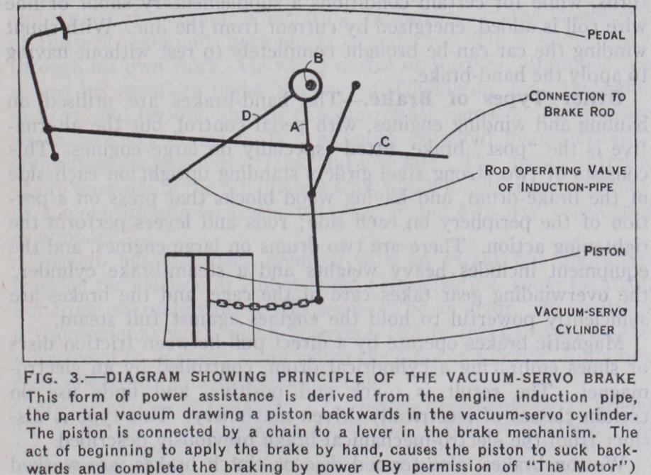 In the Westinghouse vacuum-servo system a brake cylinder has one end open to atmosphere, the other end communicating with the engine induction-pipe through a control valve which regulates the resultant pressure on the piston. The brake levers are so devised that application of the brake pedal first brings the brake shoes into contact with the drums; then further foot pressure affects the control valve and opens the communication between induction-pipe and brake cylinder, thus causing the pressure of the atmosphere to move the piston and tighten the brakes still more. The braking force is directly dependent on the foot pressure.