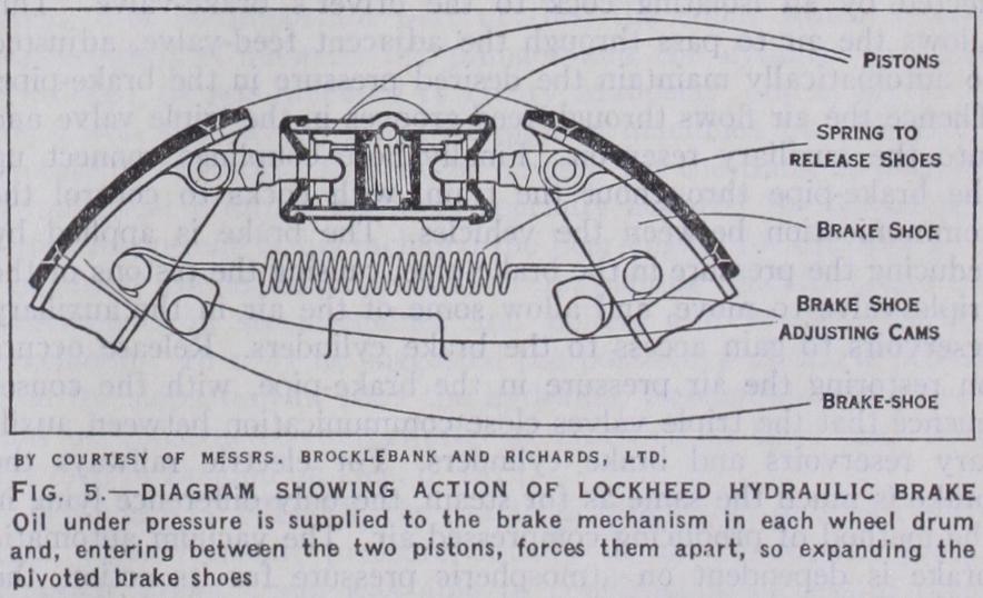 The Westinghouse power-brake acts by air from a small com pressor or by gas from the explosion chamber of a petrol engine. The control may be exercised either by foot-valve or hand-valve, and the brake-cylinder for each wheel is in the form of a pair of covers, one with foot to bolt to the chassis. The cylinder diame ters range from yin. to rein. according to weight of vehicle. Instead of a sliding piston, there is a flexible diaphragm (see fig. 4) that moves as the pressure comes through the pipe joined up at the back cover, and pushes the rod outwards. The latter connects to a reversing crank, and so to the brake-rod. There is a slotted link fitment to the existing hand-brake to make this independent of the power-brake. Hydraulic power has the ad vantages of simple flexible pipe connections to the wheels, and a perfectly compensated action, since the pressure is equal in all directions. The Lockheed system, which is fitted to numerous makes of cars, has a small pump or master cylinder attached to the flywheel housing, forcing oil along pipes and through rein forced rubber connections to a cylinder in each brake assembly. Two small pistons in each cylinder expand the brake shoes, as evident from fig. 5 (from a Brocklebank car). The shoes are pivoted at the opposite side of the circle, in the usual manner. The pistons are r 4in. in diameter, and the normal pressure is about r oolb. per sq. in., rising to 3 5olb. in emergency. The fluid used is a mixture of equal parts of castor-oil and ether, and certain stabilising ingredients added.