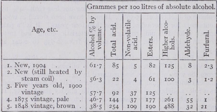 Normal propyl alcohol 40.0 Normal butyl alcohol 218.6 Amyl alcohol 83.8 Heyl alcohol . . . . . . . . o•6 Heptyl alcohol 1.5 Acetic ester . . . . . . . . . 35 •0 Propionic, butyric and caproic esters . 3•o Oenanthic ester (about) 4.0 Acetal and amines . . . . . . traces It is to one of the esters—oenanthic ester or ethyl pelargonate that the characteristic flavour of brandy is supposed more partic ularly to be due. Ordonneau attributes the peculiar fragrant odour to a small quantity of a terpene which in old brandy becomes oxi dized. The nature and proportion of the secondary ingredients vary, however, depending primarily upon the character of the wine employed, which in its turn is liable to many varying influ ences. The type of fruit and the composition of the soil are of first consideration. In the Cognac district, where the soil is mainly calcareous, the fruit is a small white grape with very acid juice, yielding a wine of inferior quality for drinking purposes. The wine produced in the Midi is also unsuitable for drinking and is dis tilled. This district was one of those ravaged by the Phylloxera, a disease which devastated the French vine-growing areas in the years 1875-78. Vineyards which had suffered were replanted with vines which were not appropriate to the soil, the resultant wine being of poor quality. In wines of this character, especially if they have been allowed to become sour, the proportion of acids, esters and other substances which are likely to be distilled with the alcohol and water is high. The method of distillation also has a marked effect upon the ultimate product. In the Cognac district a small "pot" still is generally used, and this, from its construc tion, ensures the retention in the distillate of the larger bulk of the volatile ingredients of the wine, to which the well known bouquet of Cognac brandy is due. Care is taken to carry out the distillation very slowly over a wood fire, a quantity of about 200 gallons of wine being operated upon in ten hours.
