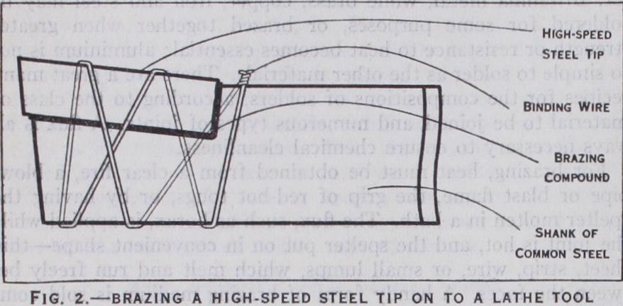 For brazing, heat must be obtained from a clear fire, a blow pipe or blast flame, the grip of red-hot tongs, or by having the spelter molten in a bath. The flux, such as borax, is applied while the joint is hot, and the spelter put on in convenient shape—thin sheet, strip, wire, or small lumps, which melt and run freely be tween the faces. A handy form of brazing medium is sold com bined with the flux, pieces being broken off and used without the need for separate fluxing. If the flow is not certain to spread properly between a joint, notwithstanding a jarring action being given to help matters, it is preferable to sandwich the spelter in, and draw the parts together by means of wire bound round or with the tongs, while clamps are utilized for some articles, such as the thinned ends of band-saws which are held overlapping in exact position during the process. Dipping into a molten bath af fords the best mode of even penetration for some joints, notably those of cycle frames.