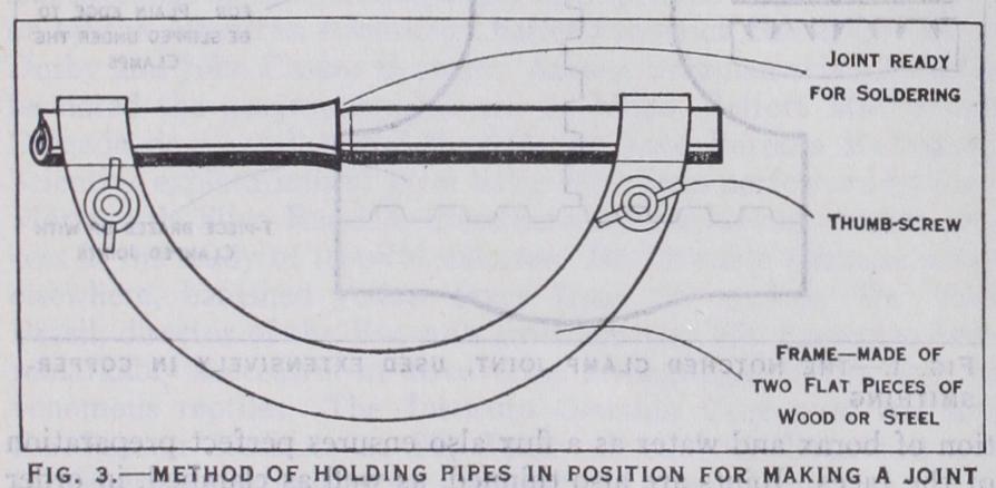 Support has to be given to some objects which do not retain their relationships naturally, including certain frames, and pipes, complicated by overhanging details. CIay, charcoal blocks, or screw clamps variously take care of these subjects; fig. 3 repre sents a divided clamp which locates pipes in their setting for a wiped joint. If faces are not bright, they must be filed, ground, scraped or shaved, or polished with emery-cloth, and a flux is req uisite to clear away oxide. Fluxes include rosin, sal-ammoniac, tallow, chloride of zinc solution (killed spirits), or one of the proprietary pastes sold in tins. "Tinning" is a process required for two reasons: to prepare faces in iron, copper, and brass ready for adhesion of the solder, and to cover the nose of the soldering iron so that oxidation will not occur while it is being used. A flux is applied to the cleaned metal in either instance, and the solder allowed to run thoroughly.