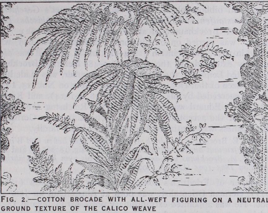 Cotton brocade fabrics may be broadly classified under the following chief modifications, viz.: 1. With all-weft figuring on a neutral ground texture of the calico weave, as in the example illustrated in fig. 2.