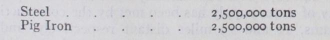 The production figures from the inception of the steel works to May 31, 1927, were:— The works supply a large proportion of the railway material re quired by the various governments of Australia, as well as meeting the demands of engineering workshops throughout Aus tralia. The population of the district immediately surrounding the works has increased since their inception by no less than 44,000 inhabitants. The wages bill amounts, under normal con ditions, to £1,750,000 per year. The original capital in 1885 was 1304,000. The authorized capital in 1927 was £3,000,000, of which £2,687,708 had been paid up; the debentures outstanding stood at £1,518,600, the reserve fund at (L. C. M.)
