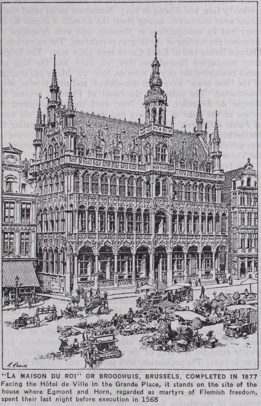Although mainly a court city and a residential centre, Brussels has numerous industries among which the manufactures of lace, carpets, curtains and furniture stand out. It is also an educational centre: the university had 1,64o students in 1925-26, while the ecole militaire trains students for the professions as well as for the army. The period since 1910 has seen many transformations in Brussels. The German occupation of the capital extended from Aug. 1914 to Nov. 1918. Gen. Sixt von Armin's troops entered on Aug. 20, and on Sept. 2 F.M. von der Goltz was appointed governor-general of Belgium. He was suc ceeded by Gen. von Bissing in 1915. Numerous social relief move ments were instituted ; among them the Comite National de Se cows had its headquarters at Brussels, and with American aid organized the feeding of the Belgian population. The executions of Philippe Baucq and of Edith Cavell took place here. The Belgian army reoccupied Brussels on Nov. 18, 1918, and the king and queen re-entered the city in state on Nov. 22. Many old quarters of the "low town" have been demolished, and new arterial roads constructed. The palace of the count of Flanders became the Banque de Bruxelles, and in Nov. 1918 the city acquired the palace of the duke of Arenberg and gave it again its old name of Palais d'Egmont. The British monument commemorating the brotherhood of the two nations during the World War of 1914-18 was unveiled in 1923; it is a replica of the Belgian monument on the Victoria Embankment, London.
