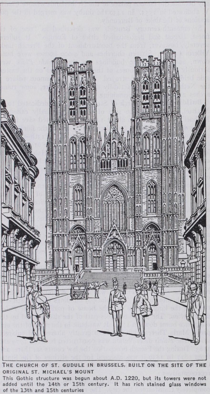 Buildings.—The church of Ste. Gudule, also dedicated to St. Michael, is built on the side of the hill originally called St. Michael's Mount. Begun about 1220 and completed save for the two towers, in 1273, it is considered to be one of the finest speci mens of pointed Gothic. The stained glass of the 13th–I5th cen turies is very rich. In many of the windows there are figures of leading members of the houses of Burgundy and Habsburg. The curious oak pulpit came originally from the Jesuit church at Lou vain, and is considered the masterpiece of Verbruggen. The church of the Sablon is said to have been founded in 1304 by the gild of crossbowmen to celebrate the battle of Woeringen. In a side chapel is a fine monument to the princely family of Thurn and Taxis, which had the monopoly of the postal service in the old empire. La Chapelle is 13th century, but much restored.