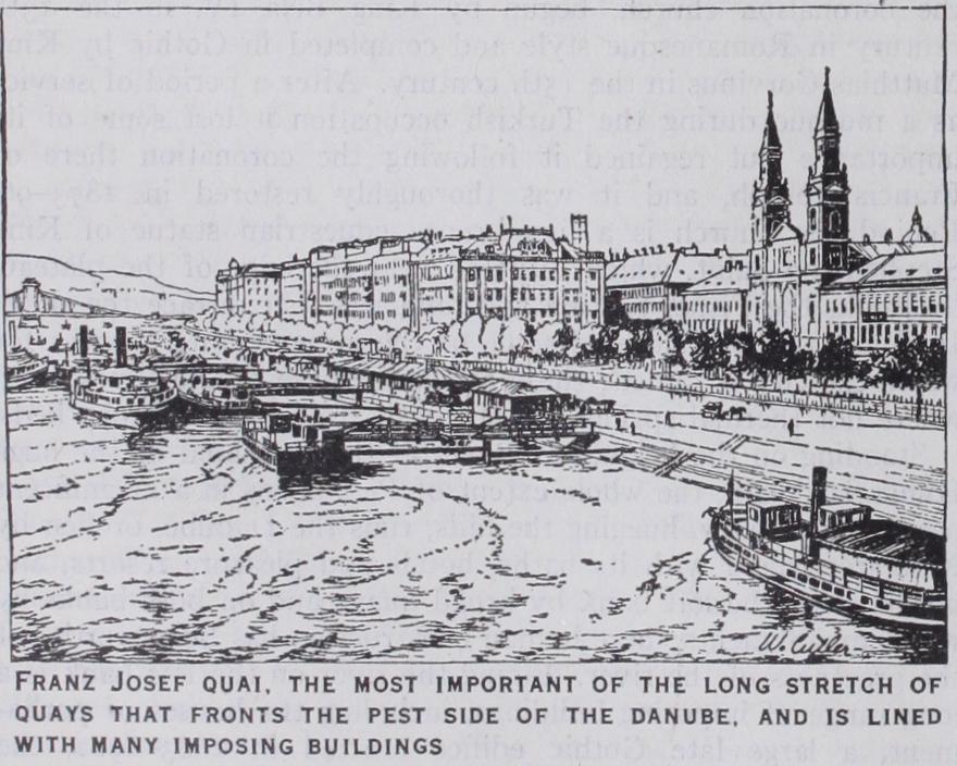 Standing on the heights of Buda, at the threshold of the huge Hungarian plain, the whole extent of Pest opens in a magnificent panorama. Below, hugging the hills, runs the Danube, broken by Margaret island with its baths, hotels and pleasure resorts, and bordered on the left bank by broad quays and on both banks by wide embankments; here human construction has been worthy of the greatness of the river. Lining the river on the left bank is a long range of imposing buildings, including the houses of parlia ment, a large late Gothic edifice erected in 1883-1902, the academy, in Renaissance style, the larger hotels and the Custom house. Beyond the left embankment, which stretches for a length of the old "inner town" of Pest is the nucleus of the city. Built on a slight elevation, sufficient in earlier times to give pro tection from flood, it is the shopping centre and is encircled by wide boulevards, the Belsokorut or inner circle, on the site of the old walls. From it streets radiate like the spokes of a wheel, while built around this inner town is the new Pest, a vast number of large dwelling-houses and public buildings intersected by two other semicircular girdles commencing and ending at the Danube, the Nagykorut or large circle and the Kiilsokorut or outer circle, beyond which lie the manufacturing districts. Narrow cobbled streets, broad acacia-bordered boulevards, wide squares, lined with substantial buildings and dotted with gardens and monu ments, all contribute to the grandeur of one of the most beautiful capitals of Europe.