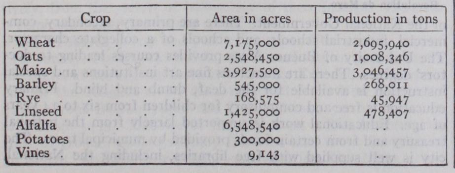 Little attention has been given to agriculture until the last quarter of the 19th century, but its subsequent development is tending more and more to displace the pastoral industry. Maize (Indian corn) and linseed are the chief crops of the north; in the centre and south-west wheat predominates; and in the south-east potatoes. Oats, barley, alfalfa, fruit and vegetables are less local ized. About 3o% of the area sown to cereals and linseed in the whole of the republic was in the Province of Buenos Aires. The land in actual cultivation increased from 3,400,000 ac. in 1895 to approximately 22,500,000 ac. in 1926. The areas and productions of the principal crops for the agricultural year 1925-26 are given in the table below :— Fruit-growing—peaches, grapes, pears, strawberries and figs— has made good progress, especially on the fertile delta of the Parana river.